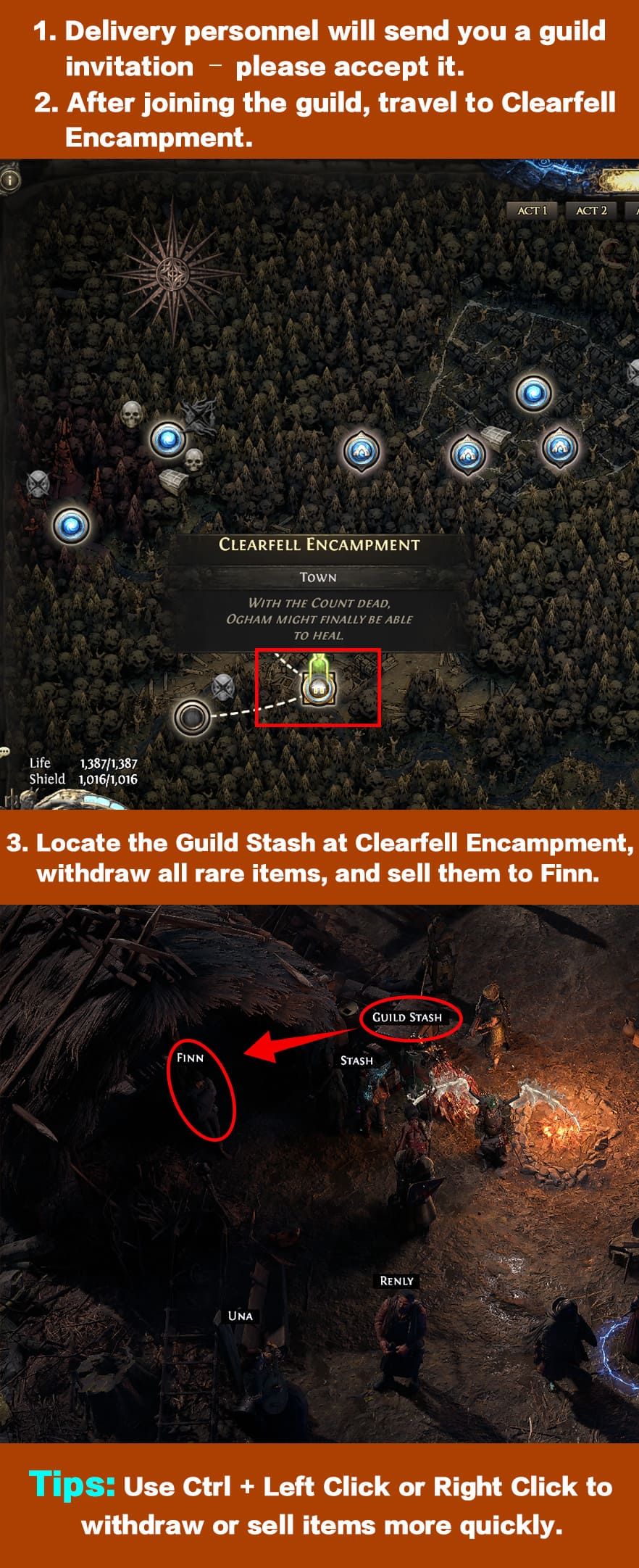 3. Locate the Guild Stash at Clearfell Encampment, withdraw all rare items, and sell them to Finn.
