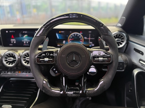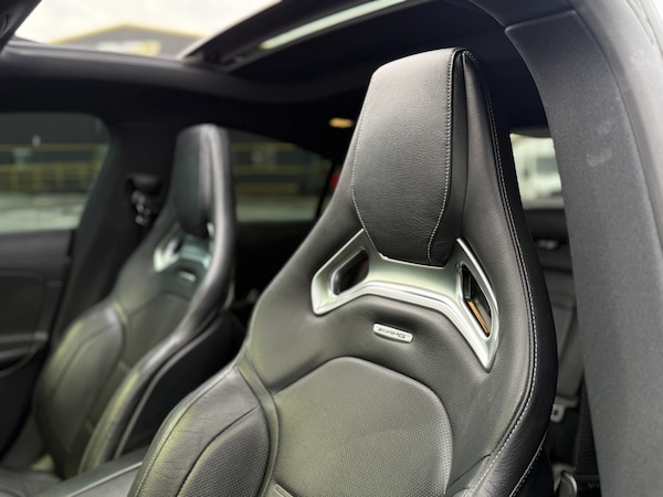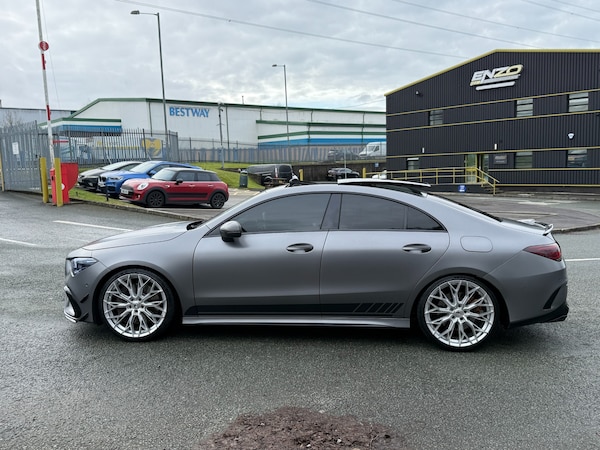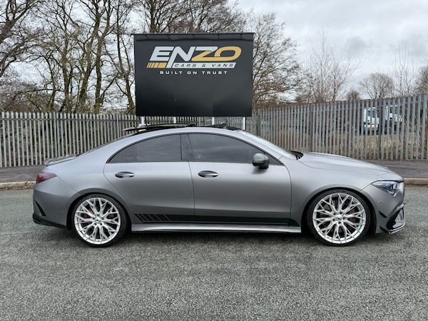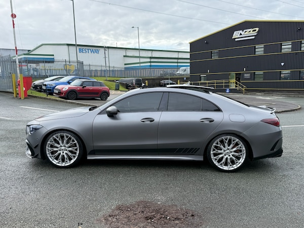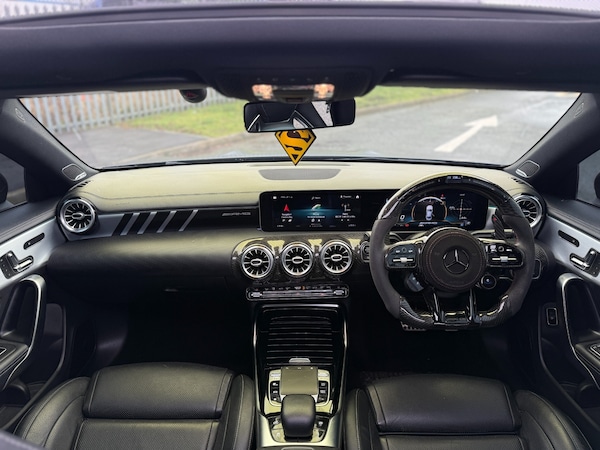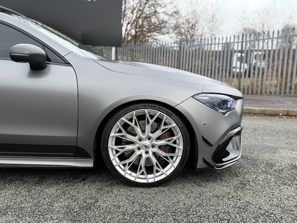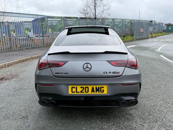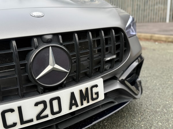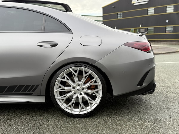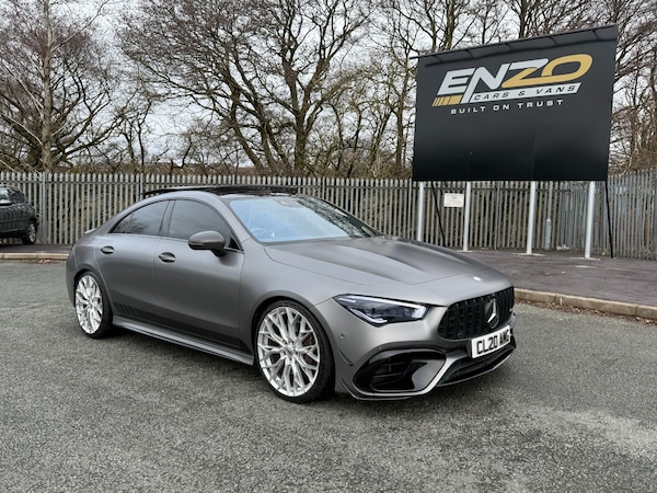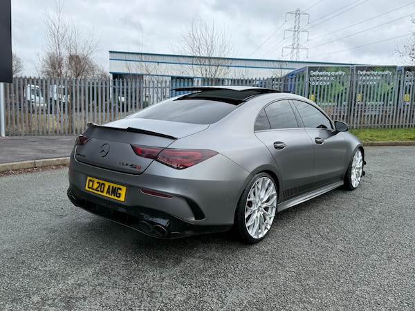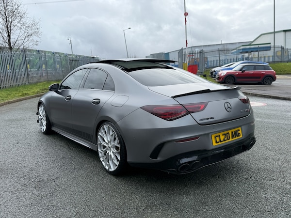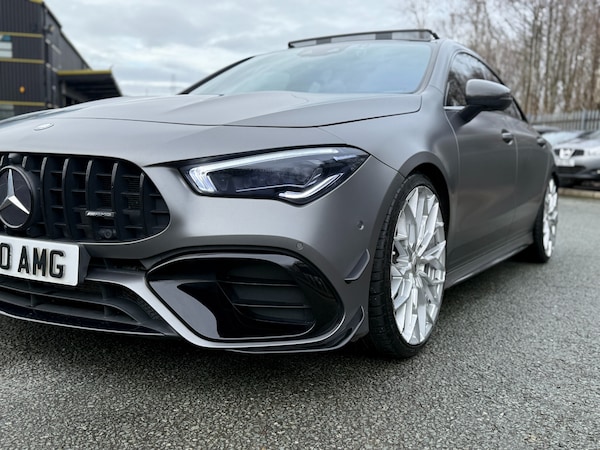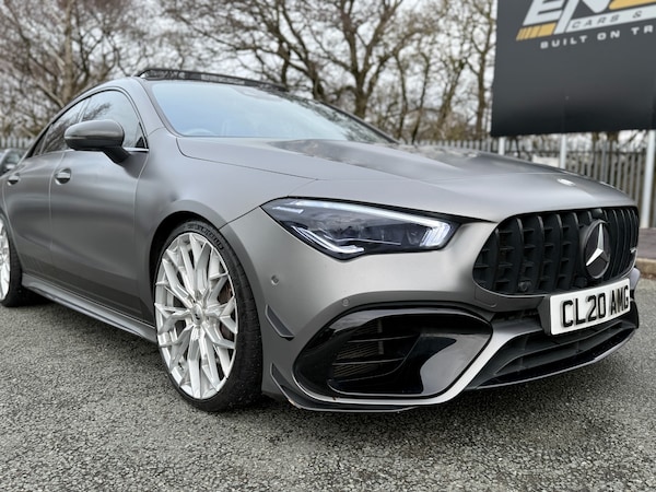 This 2020 (20 reg) Mercedes-Benz CLA 45 S AMG Plus 4MATIC+ is a top-spec performance saloon producing an incredible 421PS from its 2.0 turbo petrol engine, paired with the lightning-fast AMG automatic transmission and advanced 4MATIC+ all-wheel drive system. Finished in sleek grey with the full AMG Night Package, this car benefits from the sought-after Premium Plus specification and is loaded with virtually every optional extra available, including panoramic glass roof, Burmester surround sound system, AMG performance seats, 64-colour ambient lighting, augmented reality navigation and MULTIBEAM LED headlights. It also features AMG Drivers Package, adaptive damping suspension, AMG performance braking system with red calipers and the exhilarating AMG real performance sound exhaust. Tasteful upgrades include a valvetronic exhaust system, genuine Vossen alloy wheels and a performance intake, enhancing both sound and presence while keeping the car well-balanced and usable. With 44k miles, this CLA 45 S offers supercar-level performance in a practical four-door package and represents a superb opportunity to own one of the most powerful production four-cylinder cars ever made.