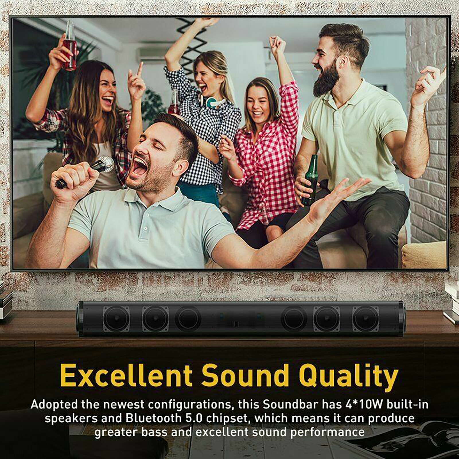3. Excellent Sound Quality: Adopted the newest configurations, this Soundbar has 4*5W built-in speakers and Bluetooth 5.0 chipset, which means it can produce greater bass and excellent sound performance. Four speakers for high performance multi-dimensional sound and an unparalleled cinematic deep bass surround sound, let you enjoy high-quality music. Watching TV at home is like watching a movie at a movie theater. It gives you a theater level sound experience.