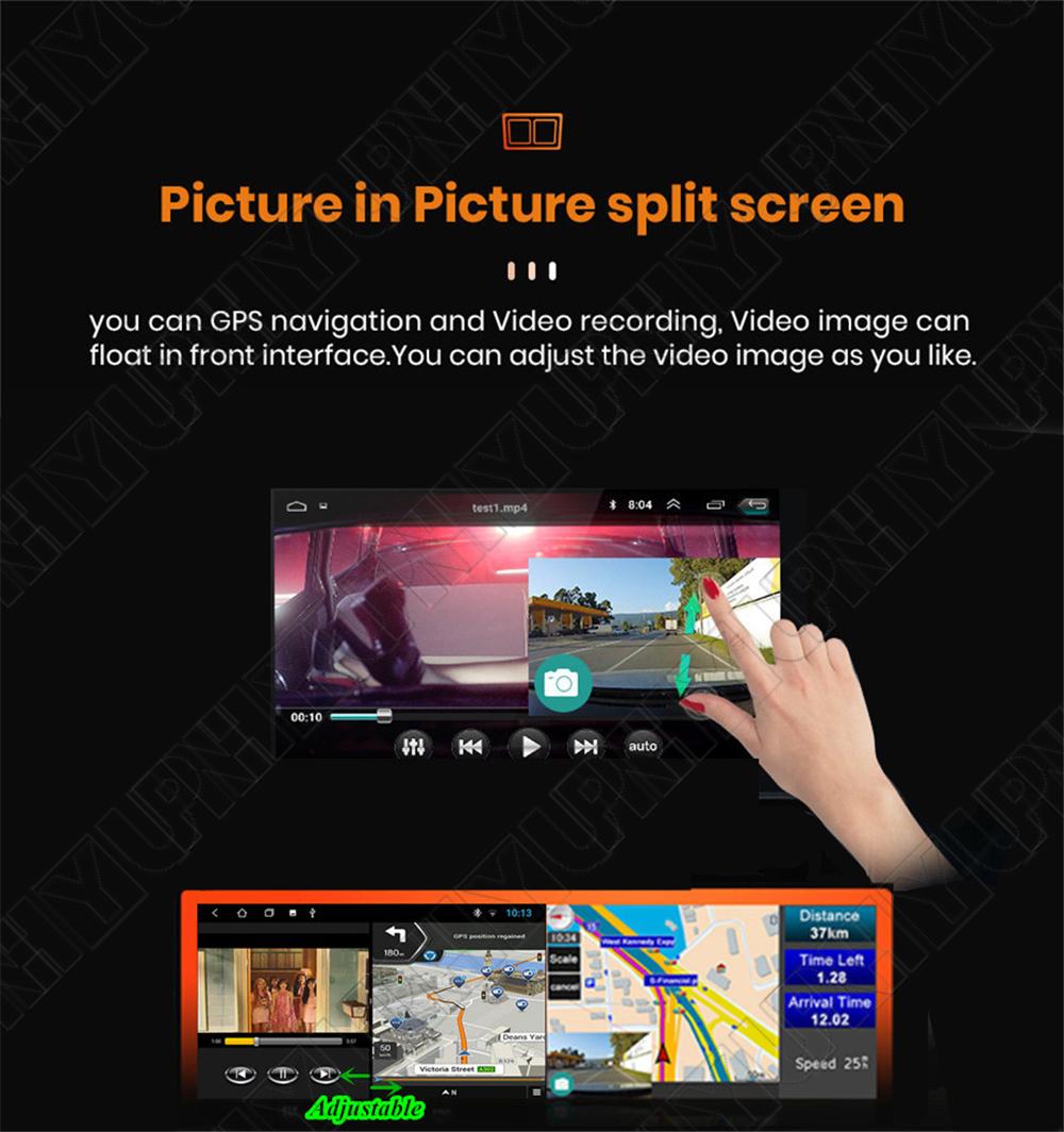 Display | - Touch Screen: Yes - Resolution: 1024*600 - Capacitive or Resistance Screen: Capacitive - Built-in Clock and Calendar: Yes, show real time and can use network-provided time - Main Menu Status Bar display: Can be changed to Music/Radio/BT-Stereo Player and Clock/Date/Week - Change Apps-Icon Position: Yes - Picture in picture split screen:Yes Split screen feature enables you to use two applications at the same time. For example running Navigation with Music Player or Radio with Navigation at the same time. Optimum convenience for both the driver and passengers. |