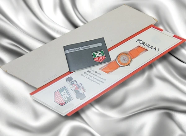 This is a TAG HEUER quartz watch “Professional 200M Formula 1 Ref.373.508.” The Formula 1 collection was introduced in 1986, inspired by motorsports. This ladies model features a vivid orange main color. The dial is matte gray with luminous indexes and Mercedes-style hands. A date display is positioned at 3 o’clock. The case combines stainless steel and fibre glass in a diver-style form. A rubber-type dedicated strap is installed.