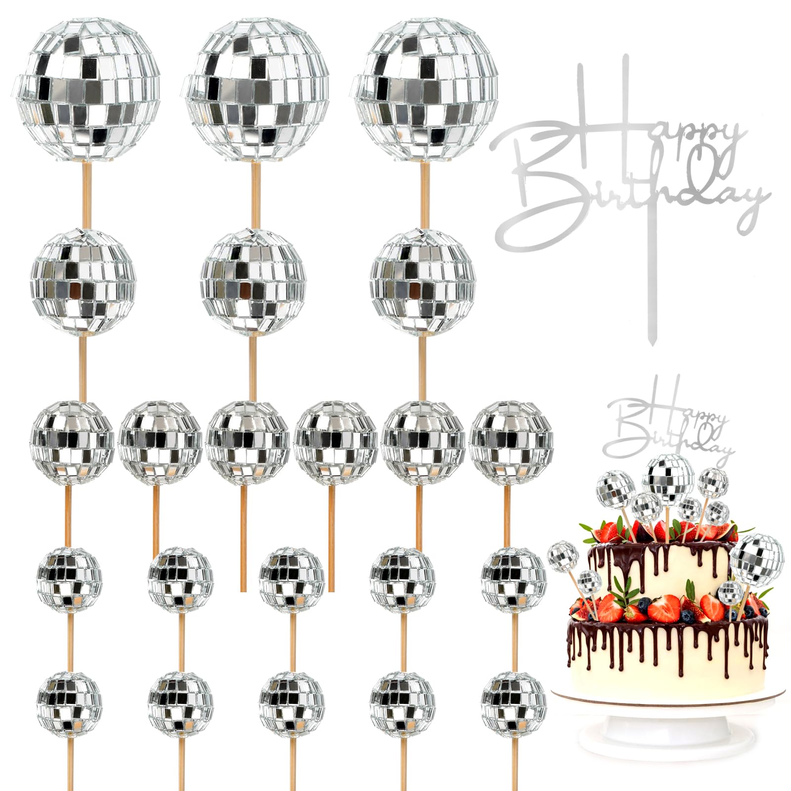 - Package Content:You will get 22pcs of the 4 size disco ball cake toppers and 1pcs silver happy birthday cake topper, which enough to meet your need for your disco decoration