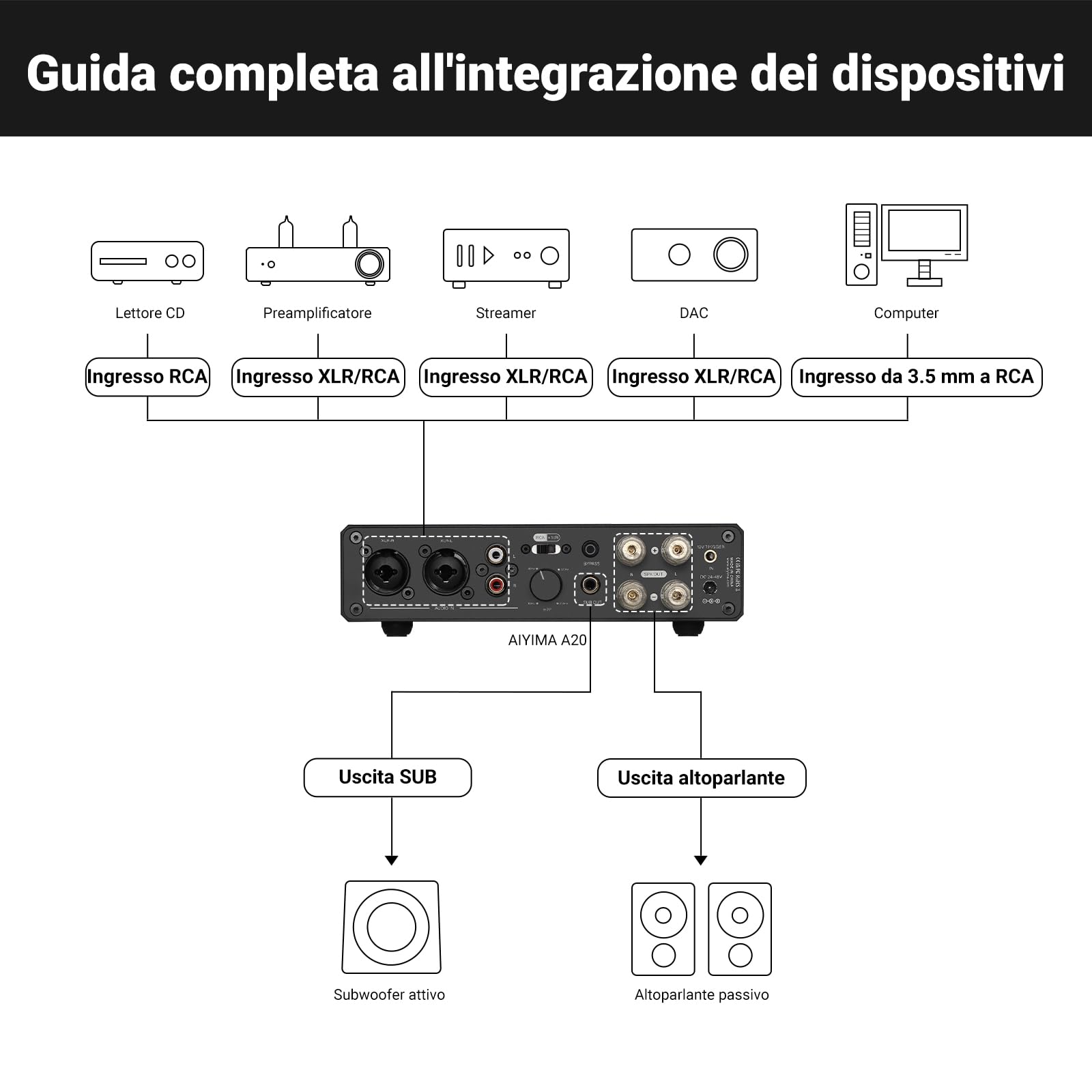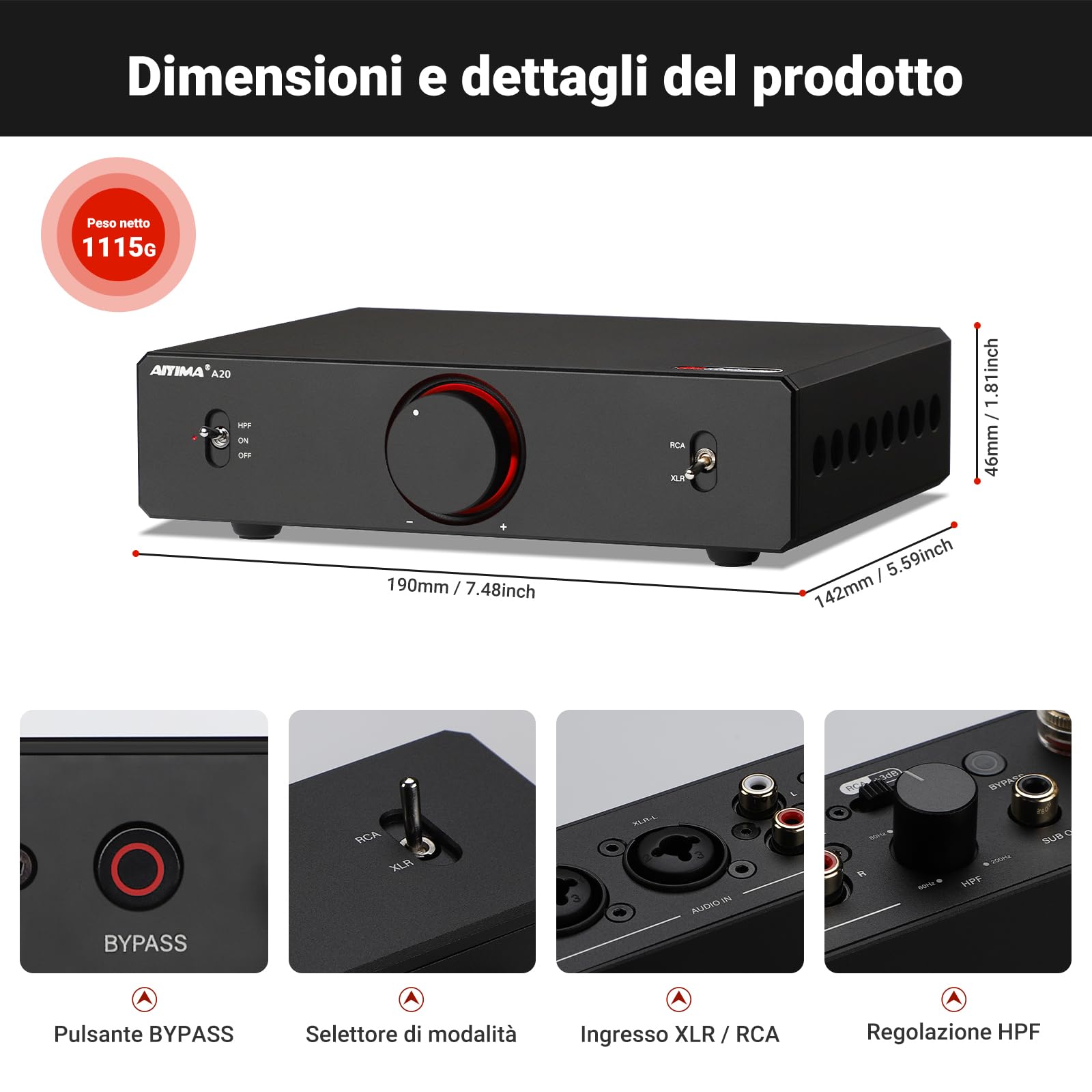 AIYIMA A20 Amplificatore stereo bilanciato con regolazione HPF Home HiFi 2.0/2.1