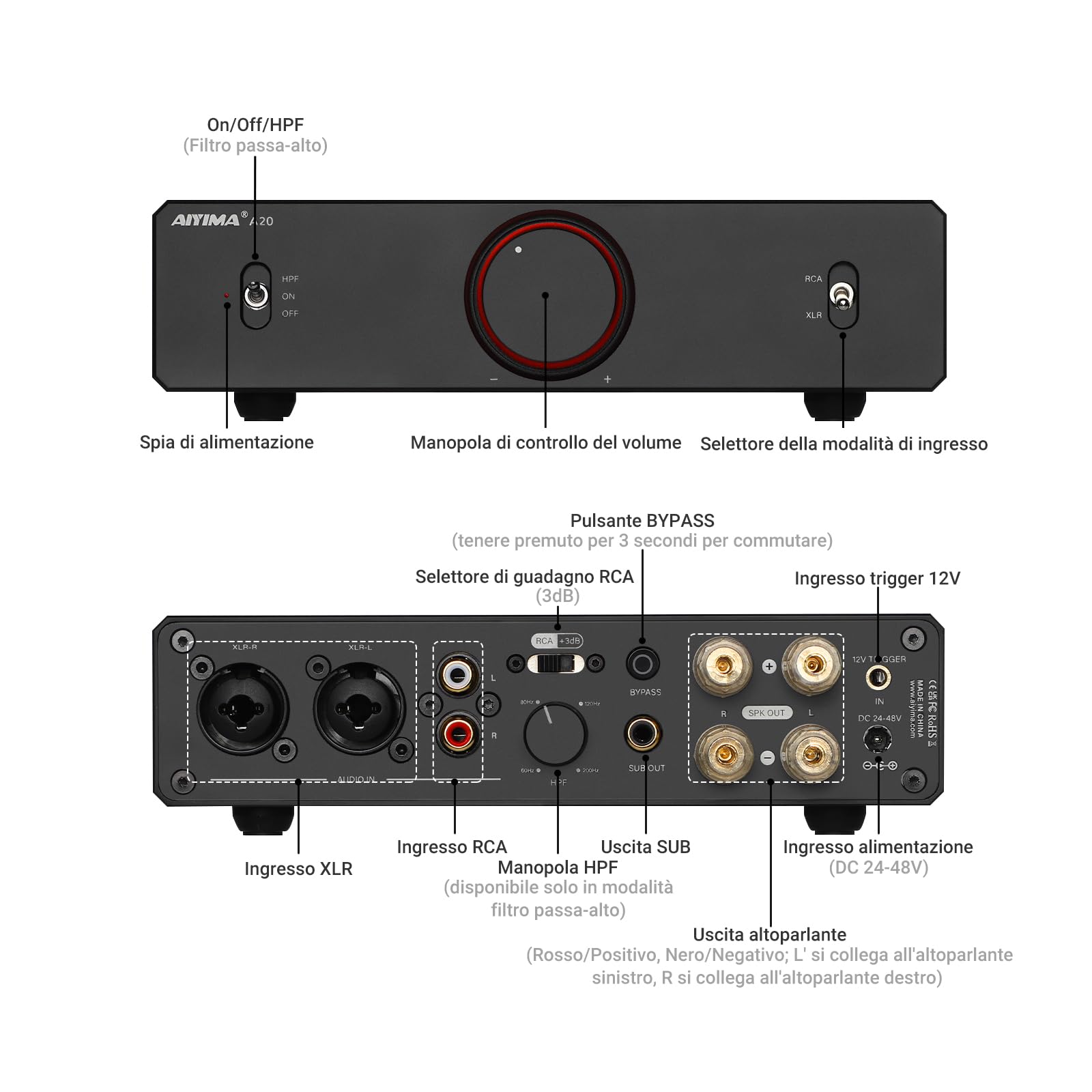 Funzione BYPASS: l'amplificatore integrato A20 è dotato di una modalità bypass che riduce la perdita di qualità audio, rendendolo un amplificatore di potenza puro ad alta fedeltà. Nota: in modalità bypass, il volume dell'amplificatore è impostato al massimo. Prima di passare alla modalità bypass, abbassare il volume all'origine per evitare danni all'udito e agli altoparlanti. Questa modalità ha una funzione di memoria; per uscirne, tenere premuto per tre secondi.