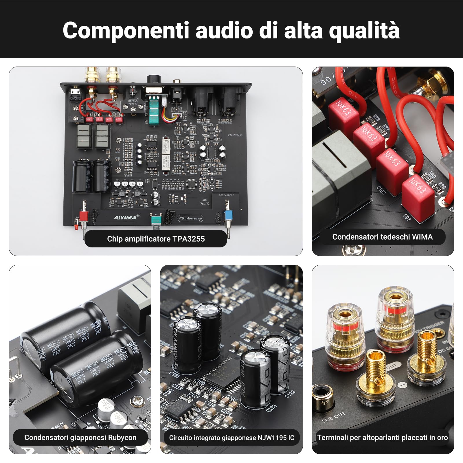 Componenti di alta gamma: l'amplificatore stereo hi-fi A20 utilizza il chip amplificatore TPA3255 Classe D ed è dotato di condensatori tedeschi WIMA, giapponesi Genicon e Ruby e terminali placcati in oro. Fornisce una potenza massima di 300 watt a 4 ohm (richiede un alimentatore da 48 V 10 A), garantendo una qualità audio eccezionale e raggiungendo un rapporto segnale/rumore (SNR) fino a 116 dB e un tasso di distorsione pari allo 0,002%, con prestazioni audio estremamente chiare e a bassa distorsione.
