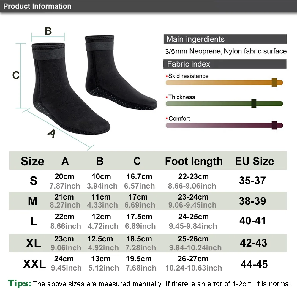【PREMIUM MATERIAL】: The diving socks are made of 3MM premium neoprene and nylon, they are soft, high-elastic and have an excellent thermal insulation performance. They can slow down the temperature loss of your feet effectively so as to keep them warm during water sports.