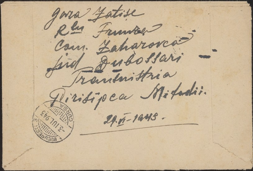 Romania, 1943. Cover franked by Transnistria issue, Scott 518, 519 pair, sent from Zaharovca to Bucharest. Tied by Pen/Pencil cancel. With handstamped Zaharovca registry etiquette and framed Cezurat Odesa handstamp in violet. Reverse with Bucharest receiver 3 Jul 943. F-VF.