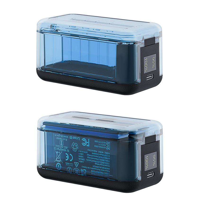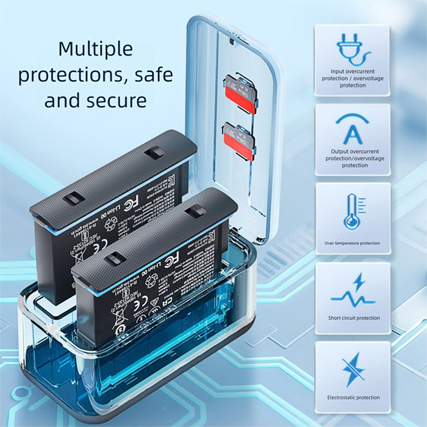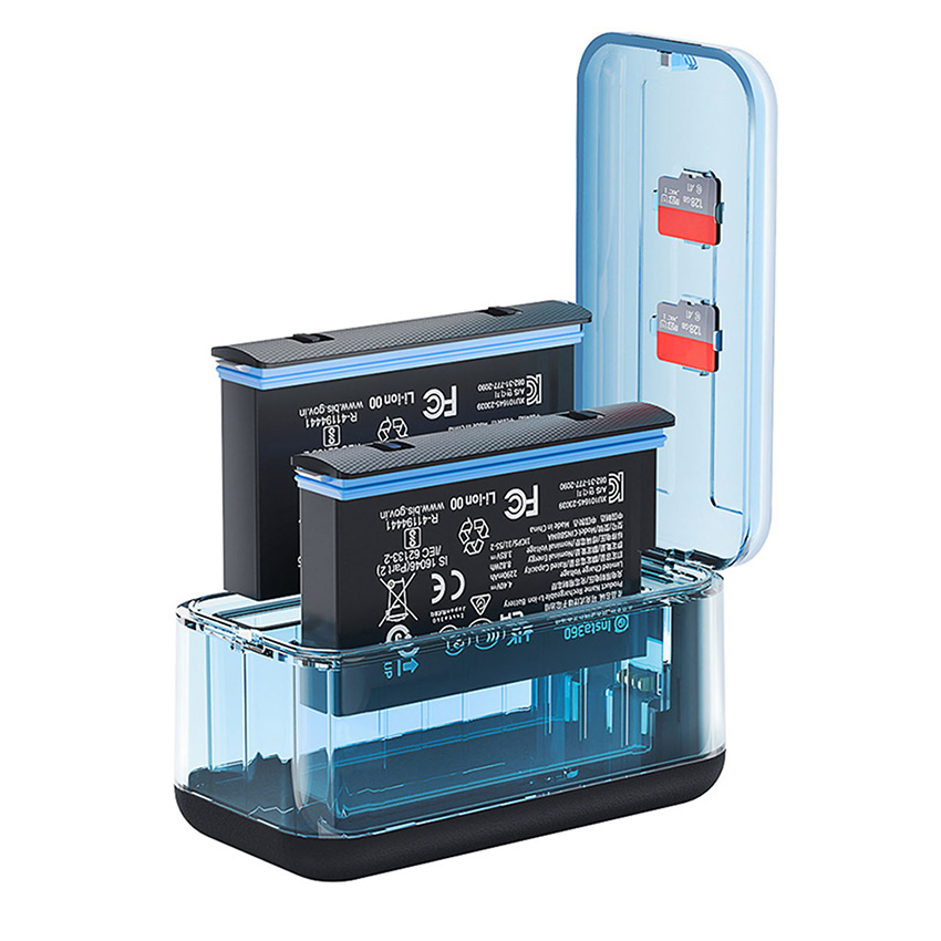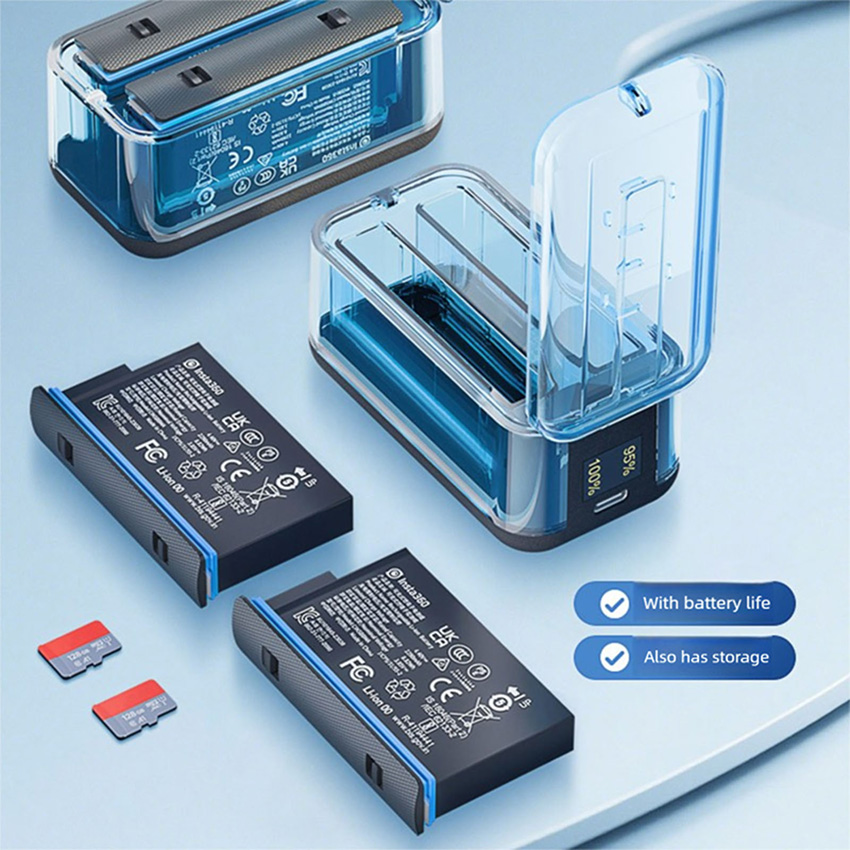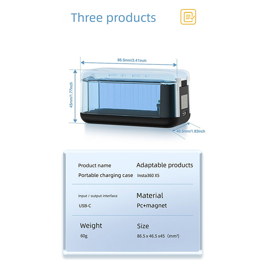 Features: l Advanced interface, universal and convenient, using USB Type - C charging interface, this mainstream interface design, not only has a strong versatility, can be adapted to many charging cables on the market is more convenient to use, so you get rid of the charging interface mismatch trouble l Fast charging, save time, charging time is only 150 minutes, charging specifications to meet the 12V3A, can realize rapid charging, Insta360 X5 charger can quickly replenish the camera's power, so that you can resume shooting as soon as possible, do not miss any exciting moments l Dual-channel intelligent display, visualization of charging management core upgrades Digital power screen, real-time display of dual-port battery power percentage (0%~100%) at a glance to grasp the status of dual batteries l Wide range of adaptation, flexible charging, adapter support 12V/3A, 9V/3A, 5V/3A output specifications, according to different use scenarios and equipment requirements, flexible adjustment of charging power. The output is 4.4V/1.5A * 3, which can meet the charging needs of multiple devices at the same time, bringing you more convenience. Whether you are charging at home with mains power or outdoors with mobile power, it works stably and ensures efficient and safe charging l Environmental adaptation, stable and reliable, the working environment temperature range is 0 degrees - 40 degrees, can adapt to a variety of different environmental conditions. However, it should be noted that when the ambient temperature is lower than 10 degrees, the charging speed will become slower. This feature ensures that the charger can work stably in most daily environments, providing reliable power for your camera l Compact and lightweight, easy to carry, the product size is 86.5*46.5*45mm, the net weight of the product is only 60G, compact size and light weight. Whether you put it in the camera bag to carry around, or put it in your pocket, it will not take up too much space or add too much burden. Let you in traveling, outdoor adventure and other various scenarios, can easily carry the charger, at any time for the camera charging l Thoughtful packaging, complete accessories, the package contains a manual, a charger and a fast charging cable. Detailed manual can help you quickly understand how to use the charger and precautions; high-quality fast charging cable can ensure stable and efficient charging process! Specification: l Material: Plastic l Size: 86.5x46.5x45mm l Quantity: 1 Set l Applicable Model: for Insta360 X5 Package: l 1x Battery Charger Set l The blue is a custom color, we only sell black