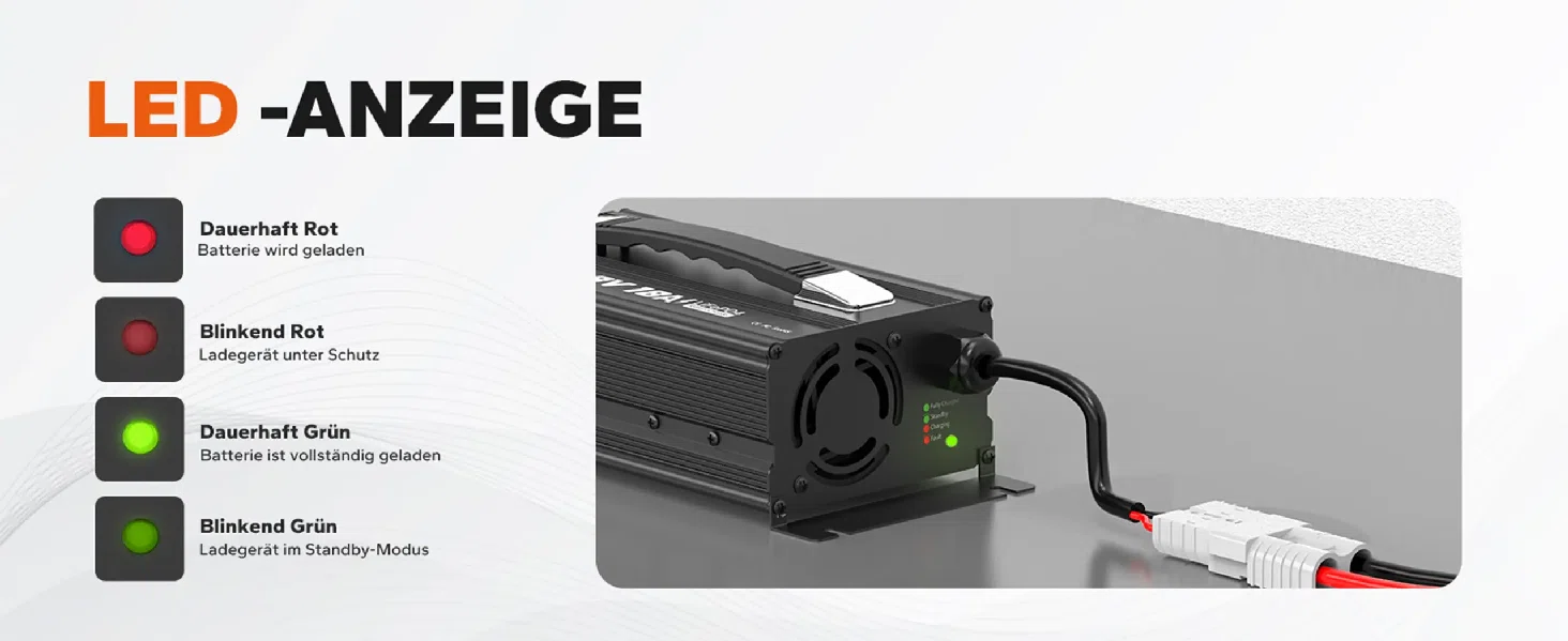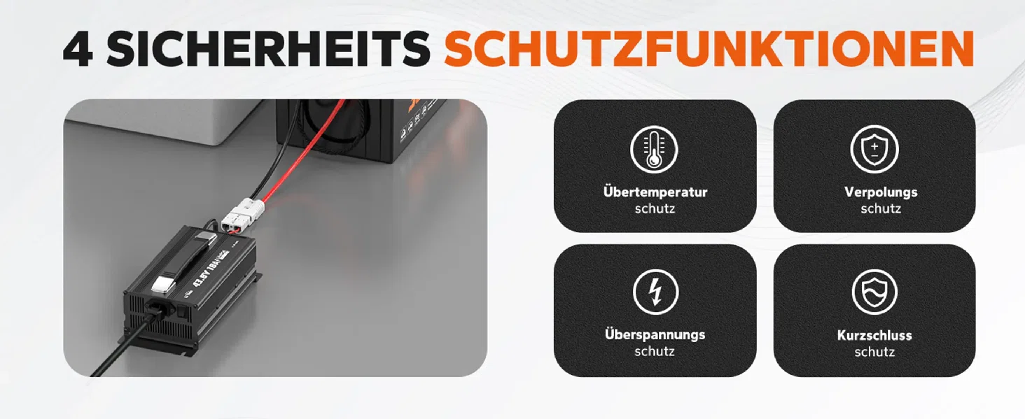 [Umfangreiche Schutzfunktionen] Mit CE- und RoHS-Zertifizierungen bietet das Ladegerät einen automatischen Übergang zwischen CC, CV und Abschaltung. Mehrstufiger Schutz vor Übertemperatur, Verpolung, Kurzschluss und Überspannung.