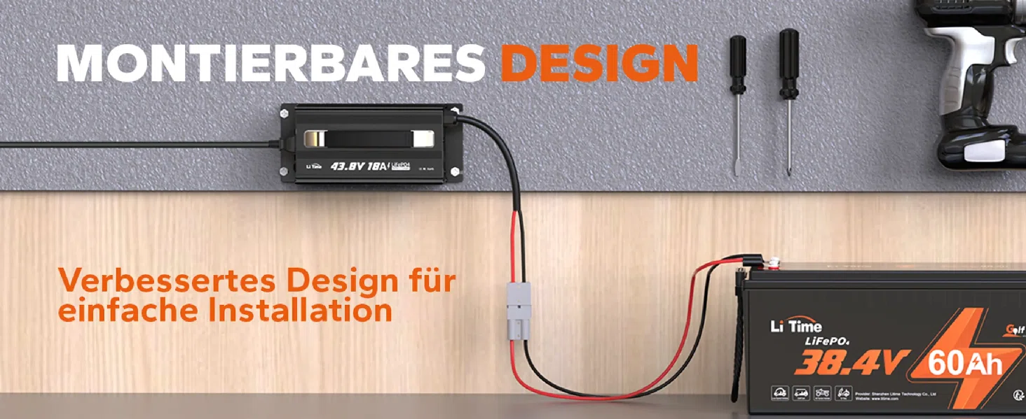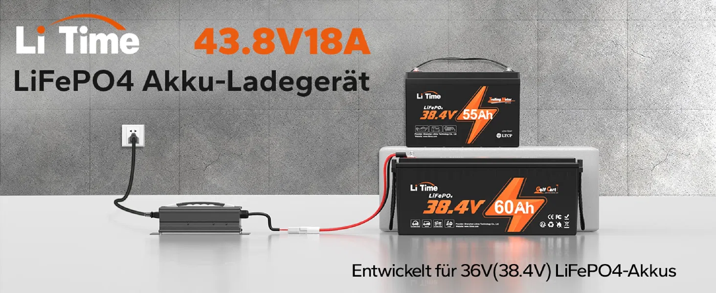[36V Lithium-Batterieladegerät] Ladespezifikationen: 43,8V | Ladestrom: 18A | Nenn-Eingangsspannung: 100V-240V AC; 50Hz bis 60Hz. LiTime 43,8V 18A Smart LiFePO4-Ladegerät für 36V (38,4V) LiFePO4-Batterien, mit Aktivierungsfunktion für BMS-geschützte Lithiumbatterien.
