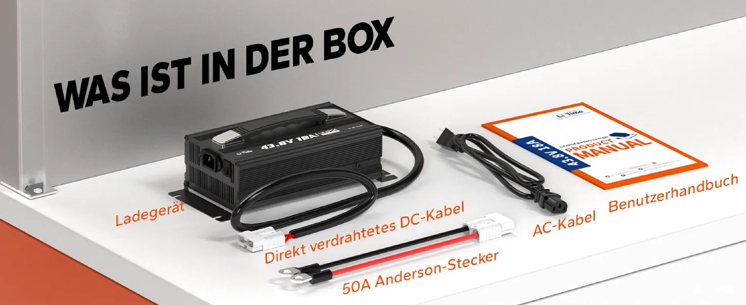 [Praktisches Upgrade] Das LiTime 43,8V18A Ladegerät hat ein separates Netzkabel und einen Griff für einfaches Tragen. Mit dem neuen Ein-/Ausschalter und einem 50A Anderson-Stecker ist das Laden sicher und bequem.