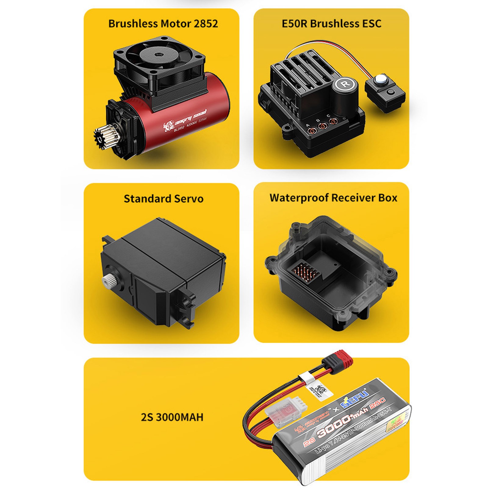 A complete ready-to-run RC car with 4200 kV brushless motor, 50A ESC, and 2.4 GHz transmitter for drift and off-road performance.