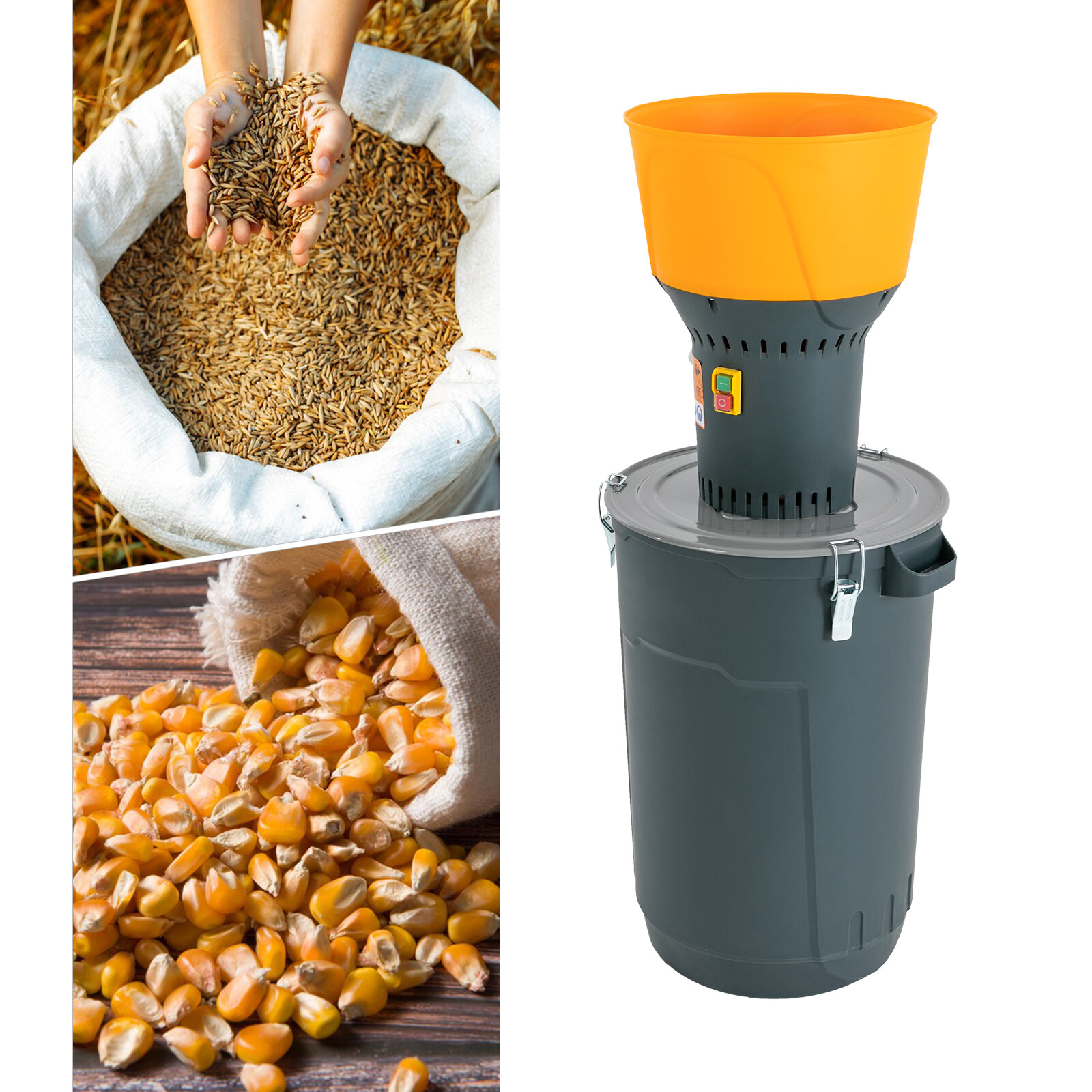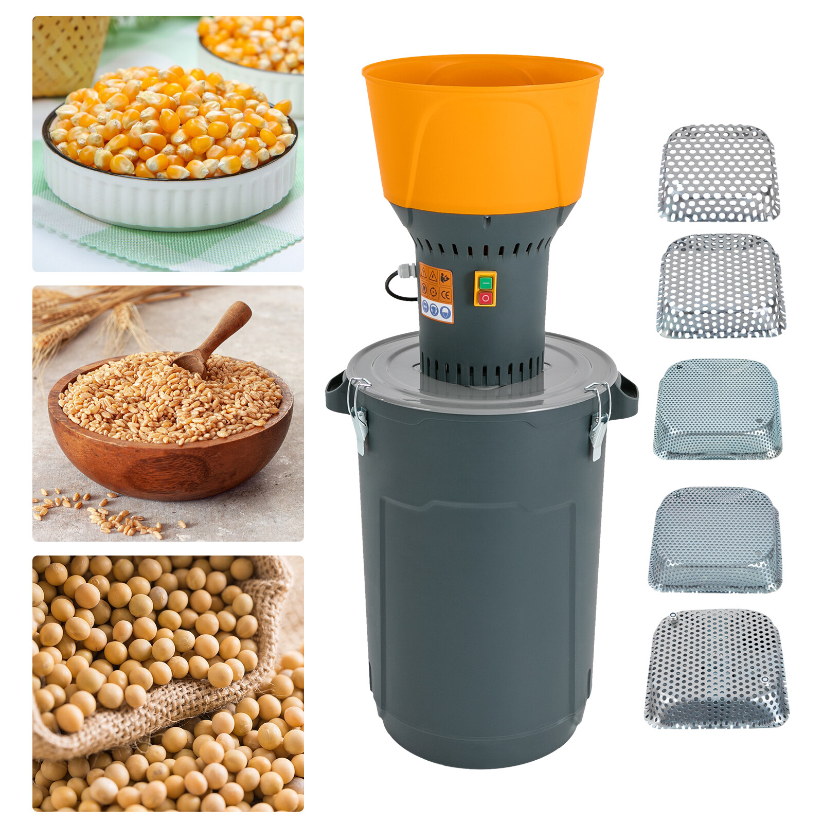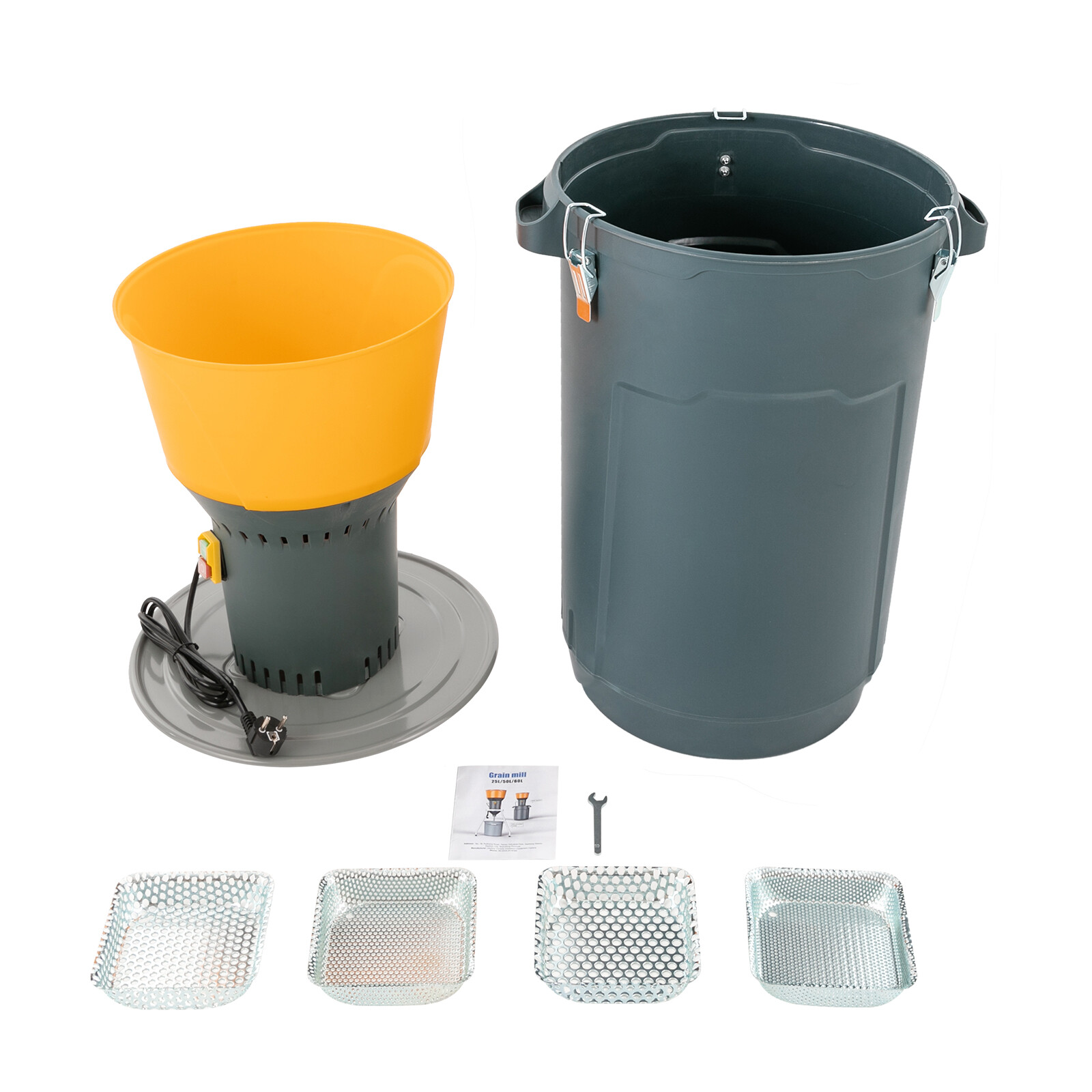 A high-capacity, pillar-style electric grain grinder mill. Features a powerful 1300W copper-core motor, a large 60L collection bin, and comes with 5 interchangeable grinding screens for precise texture control. Requires assembly.