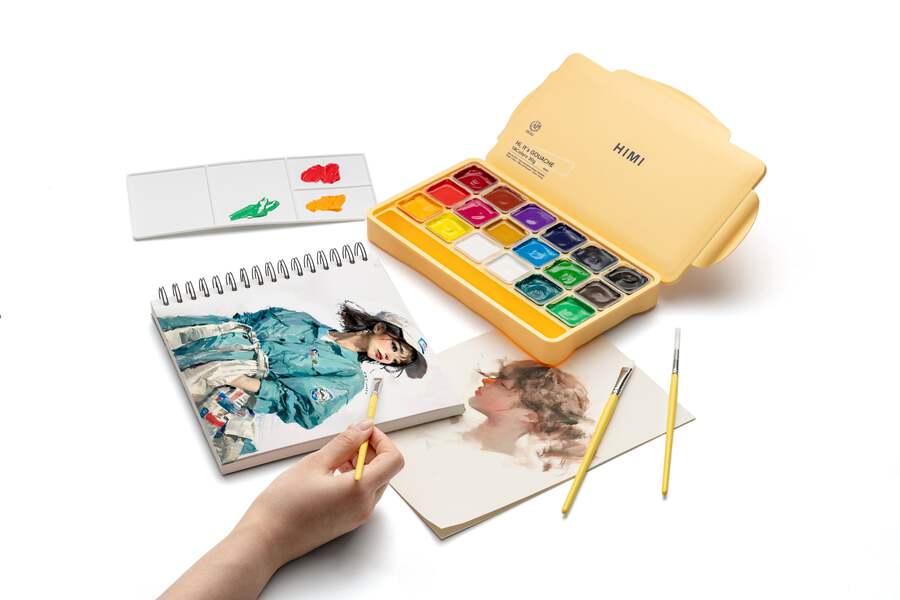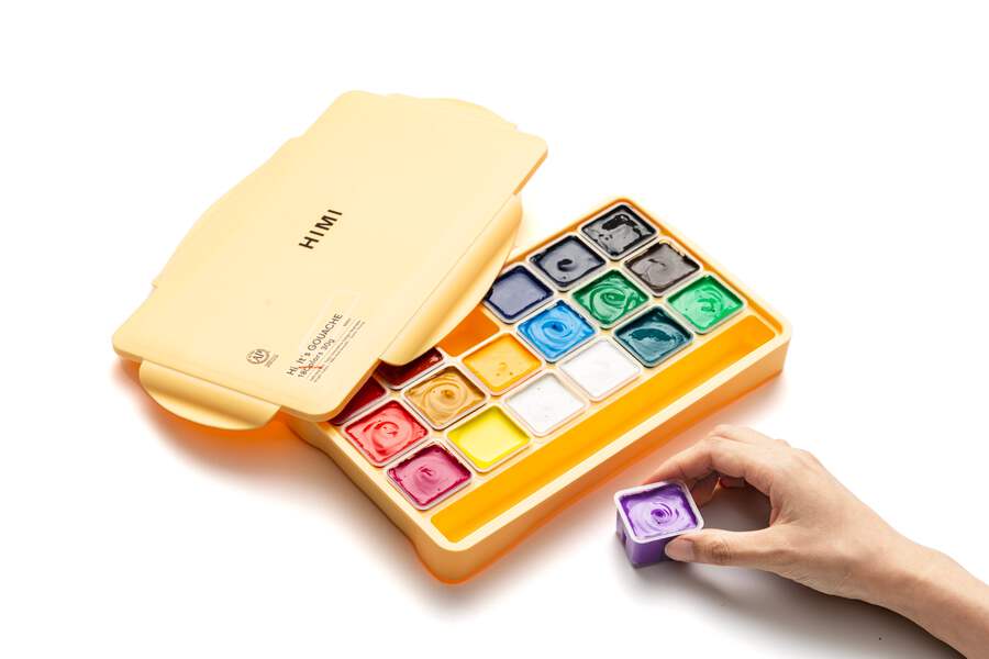 The HIMI Jelly Cup Gouache Set - 18 Colours (Yellow Case) is a compact, resealable cup set designed for bold, opaque colour with minimal setup. Open the lid and paint - perfect for quick studies, sketchbooks and beginner-friendly gouache work.