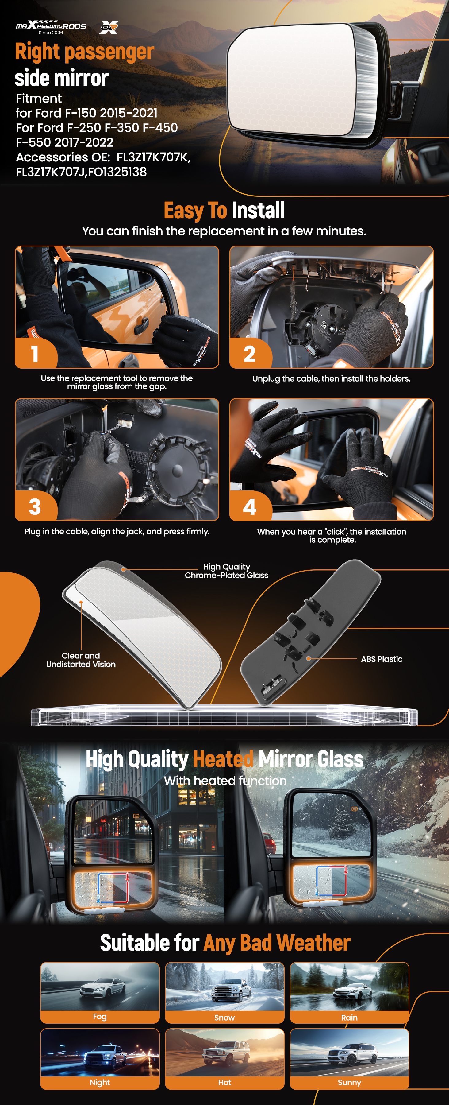 Right Passenger Lower Mirror Glass For Ford F-150 2015-2021 F-250 FL3Z17K707K