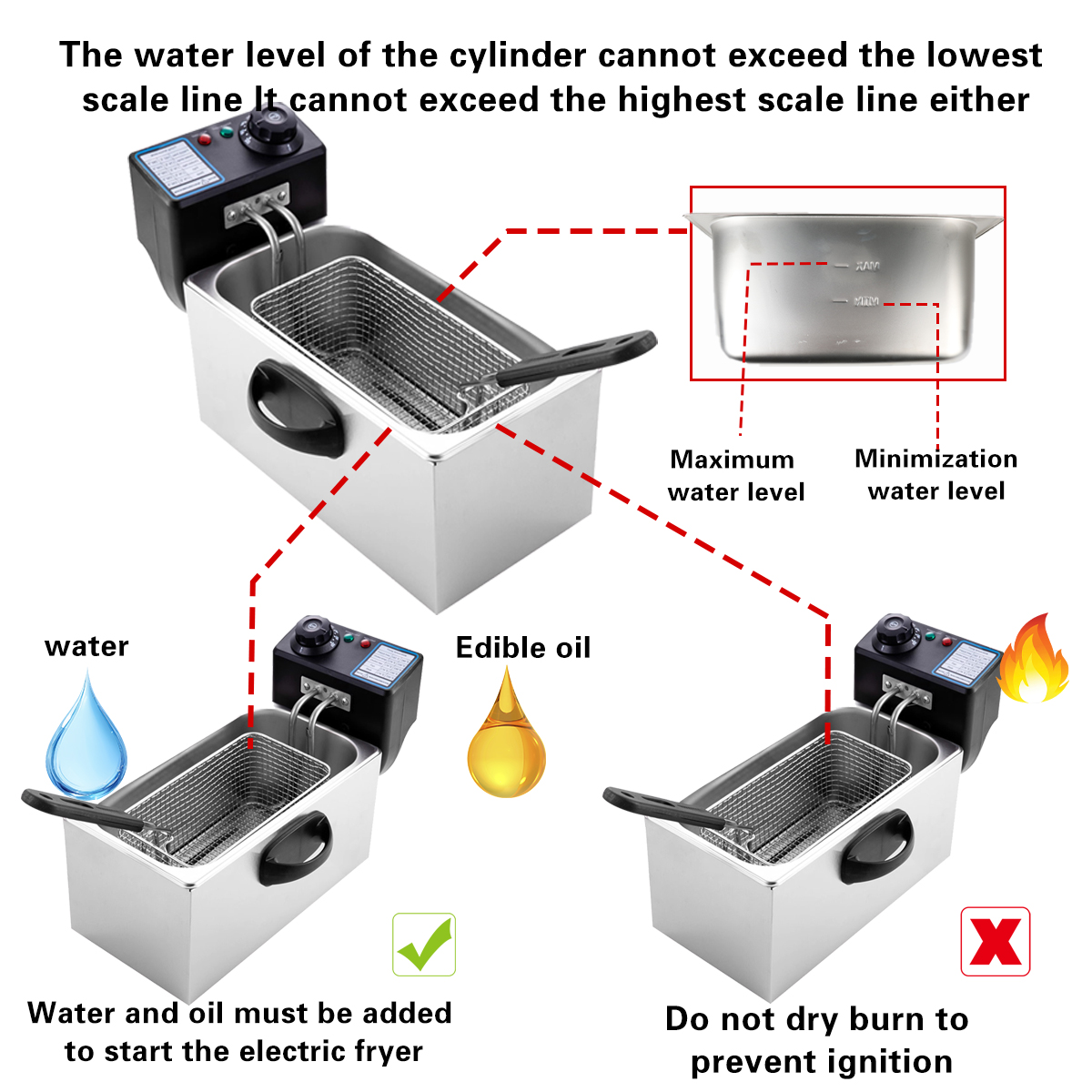 When operating an electric deep fryer, always add a proper amount of cooking oil to the fryer, ensuring the level is between the minimum and maximum marked lines. Do not activate the fryer without any liquid or media (e.g., food) present.