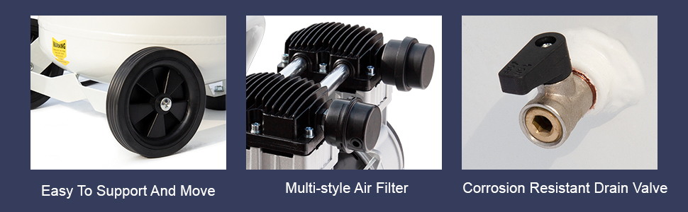 Includes overheating protection to prevent motor damage during extended use. Anti-vibration rubber feet and a durable housing ensure stable operation, while a reliable drain valve simplifies moisture removal.