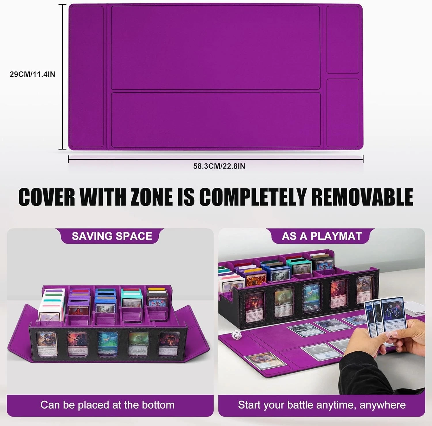 Magnetic Closure: The removable cover with zone but no text, attaches to the card box with powerful magnets, but it also can be easily removed and placed at the bottom to save space, as a playmat for MTG/PTCG or provide a neat surface when organizing