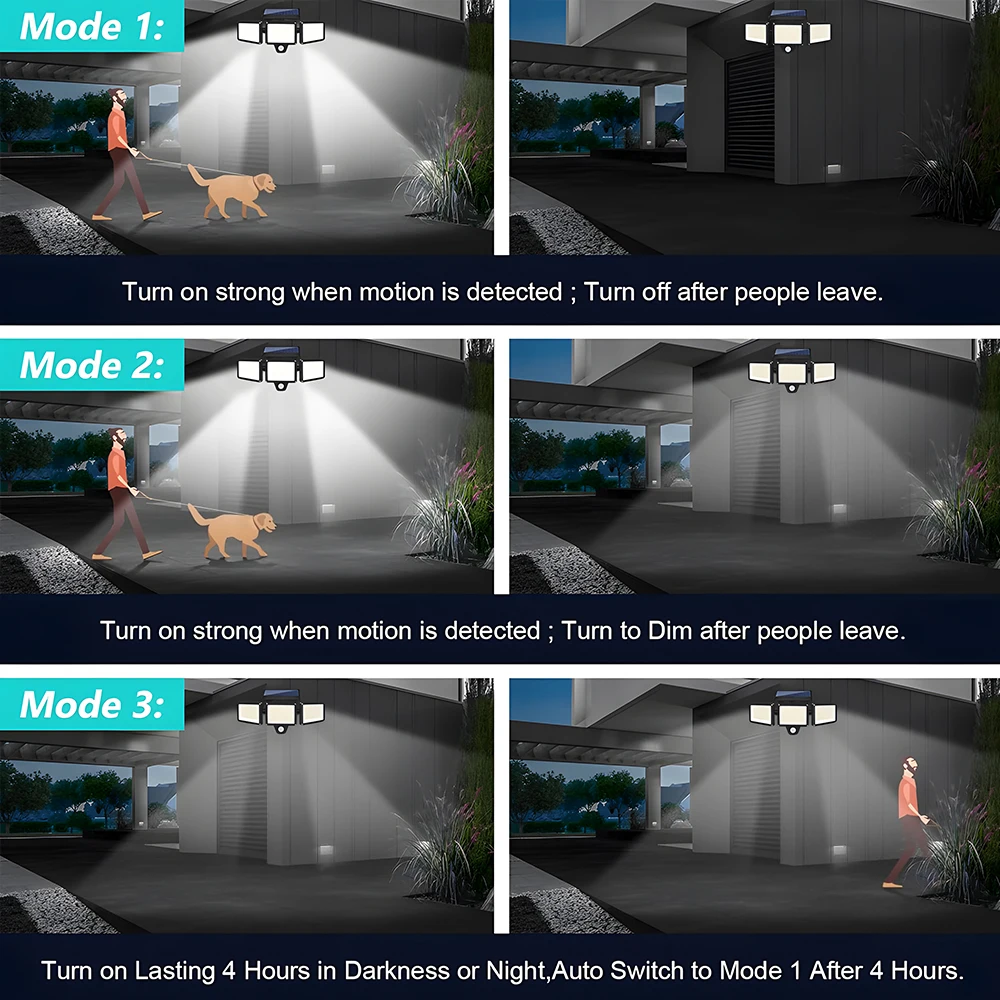 【Remote Control & 3 Lighting Modes】:Each solar motion sensor light is equipped with wireless remote control.You can choose the most suitable mode faster and more portable: ①Strong light sensor mode ② Dim light sensor mode ③Strong long light mode. Different lighting way for your daily requirement.