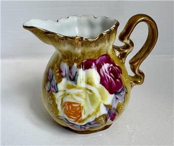 Dainty vintage mini floral pitcher standing 3" high and marked "Hand Painted Nippon" with the maple leaf mark. This sweet little jug from Japan is covered with large roses and other flowers on a pale yellow background. There is gold trim on the handle and around the rim and base. It's in excellent condition with no chips, or cracks and only minor loss of the gold paint, including a small "flea bite" on the rim. Be sure to enlarge my photos for details on the condition. Such a pretty addition to your vintage table!