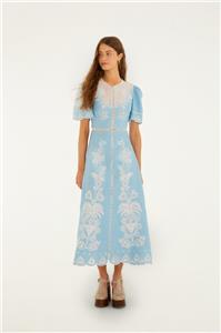 - Farm Rio Light Blue Embroidered Premium Linen Midi Dress