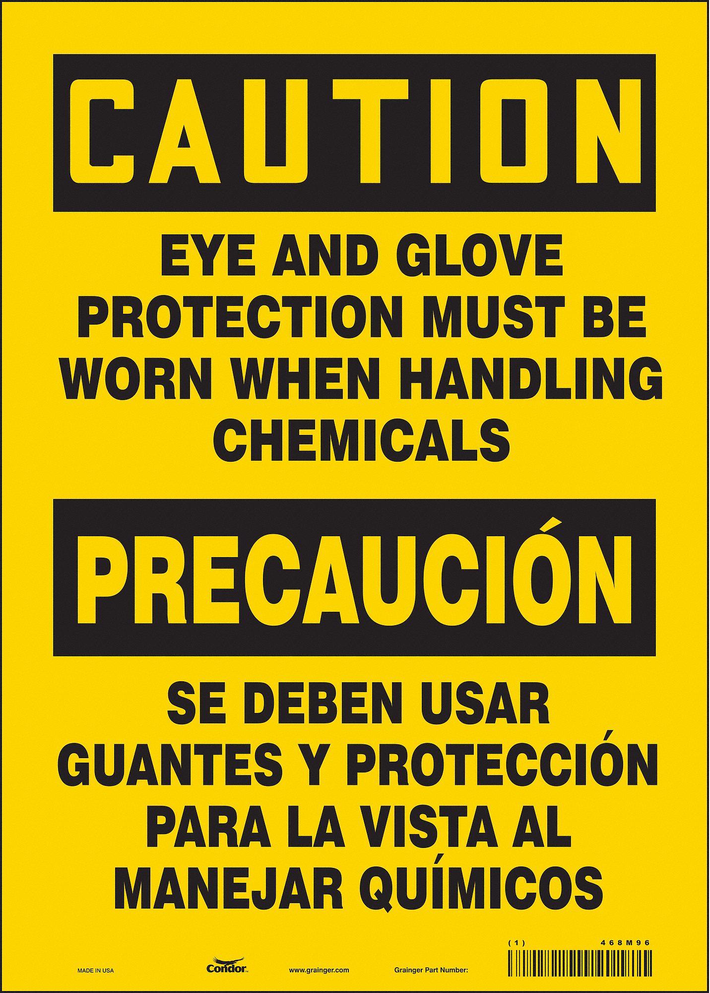 Safety Sign, Vertical Rectangle, Number of Printed Sides 1, English, Spanish, Sign Format Traditional OSHA, Sign Legend Eye And Glove Protection Must Be Worn When Handling Chemicals/Se Deben Usar Guantes Y Proteccion Para La Vista Al Manejar Quimicos, Sign Legend Background Color Yellow, Sign Legend Style Text