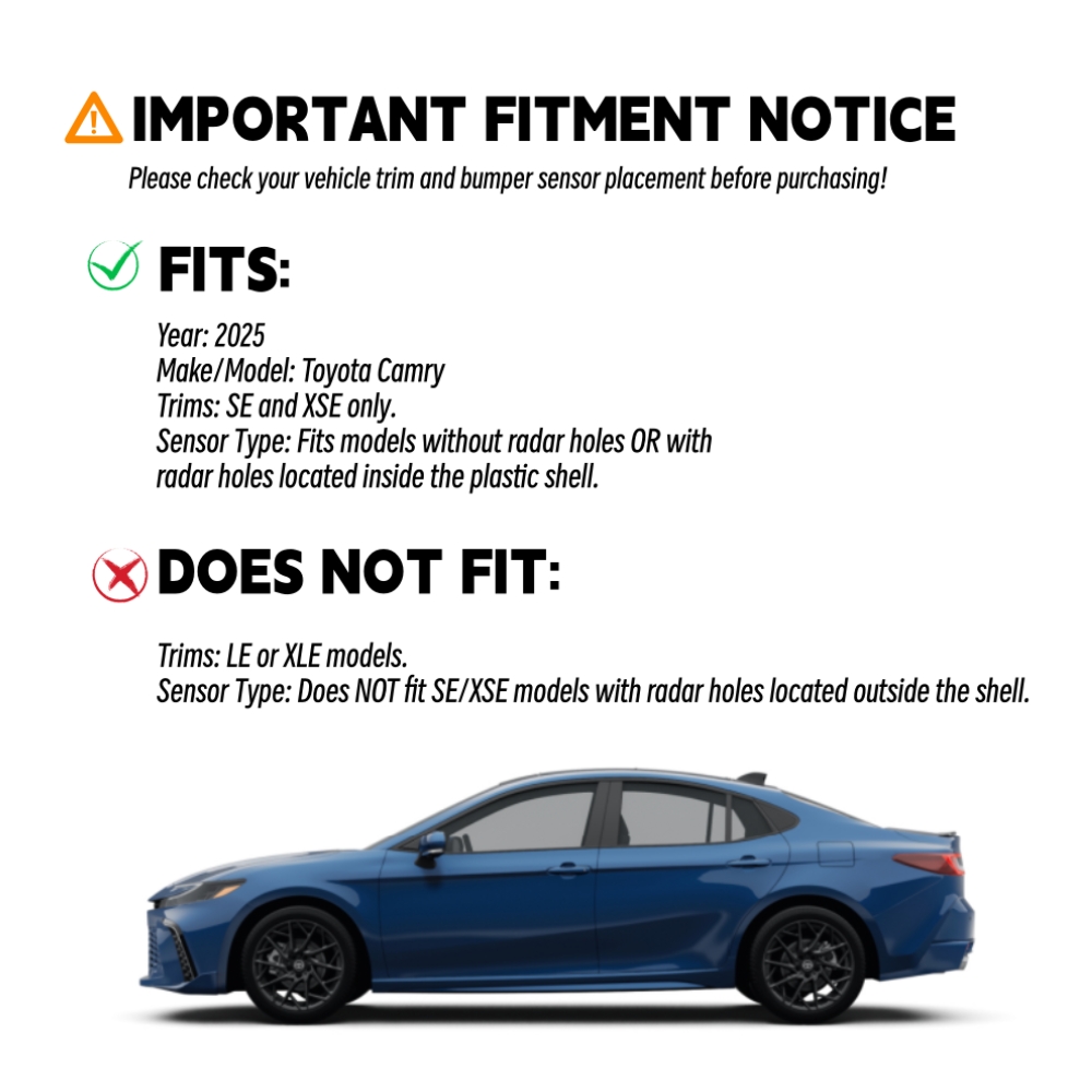 - Sensor Type: Does NOT fit SE/XSE models with radar holes located outside the shell.