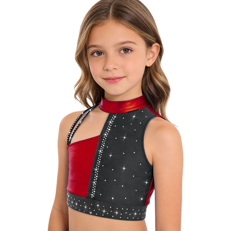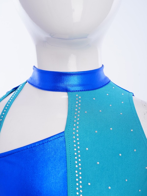 Shiny rhinestones and metallic color-block elements bring a glamorous and eye-catching effect, perfect for performances and competitions.