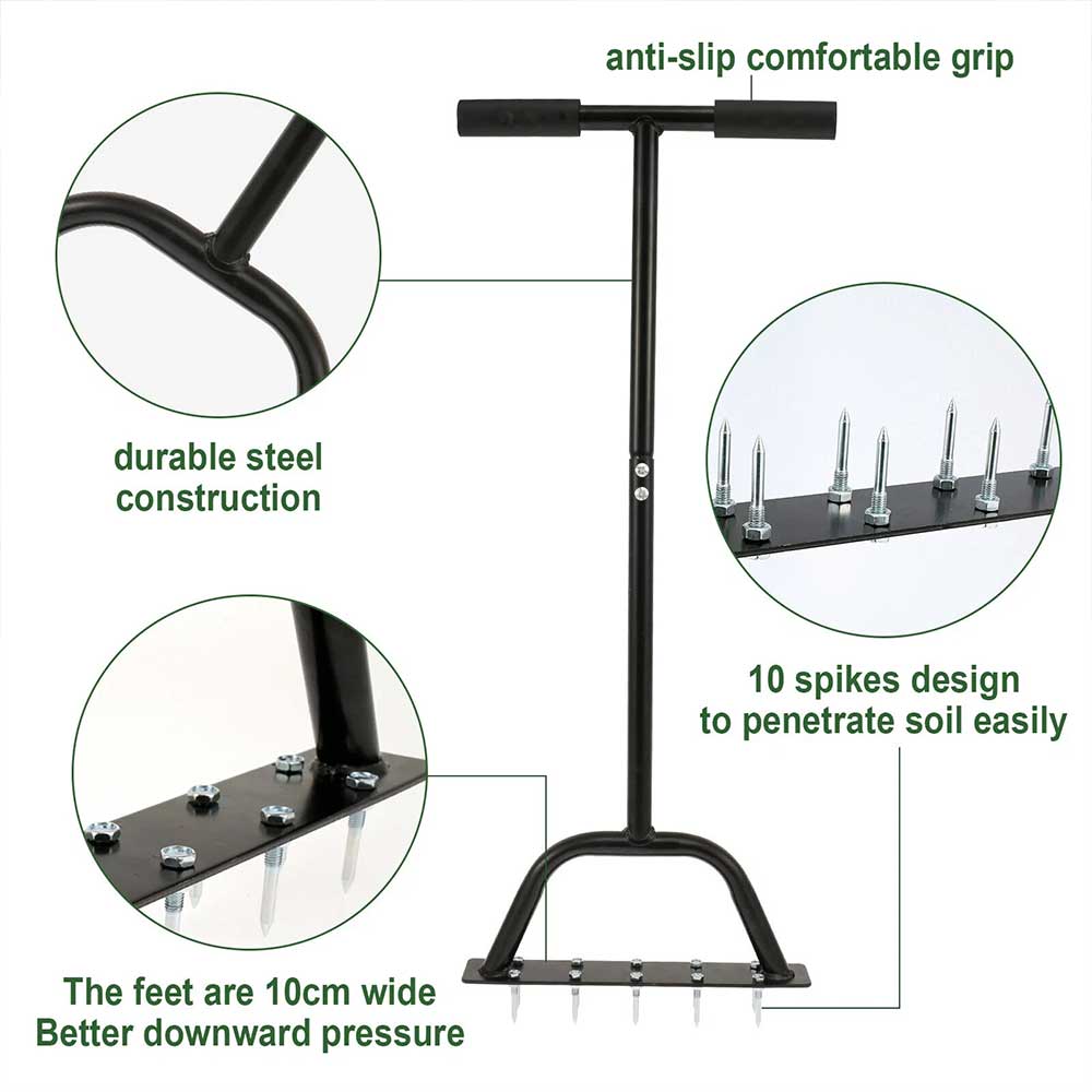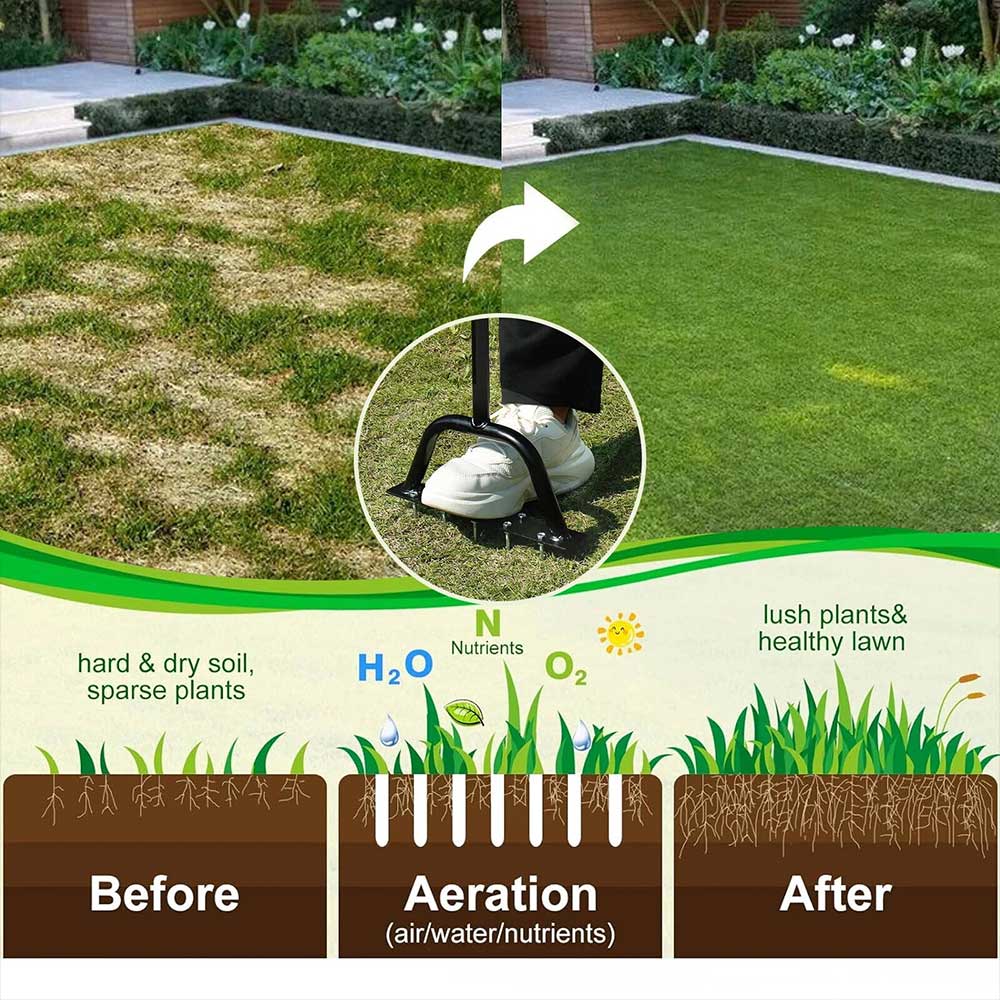 • Deep Root Nourishment: Loosens compacted soil/thatch → boosts air/water/fertilizer penetration