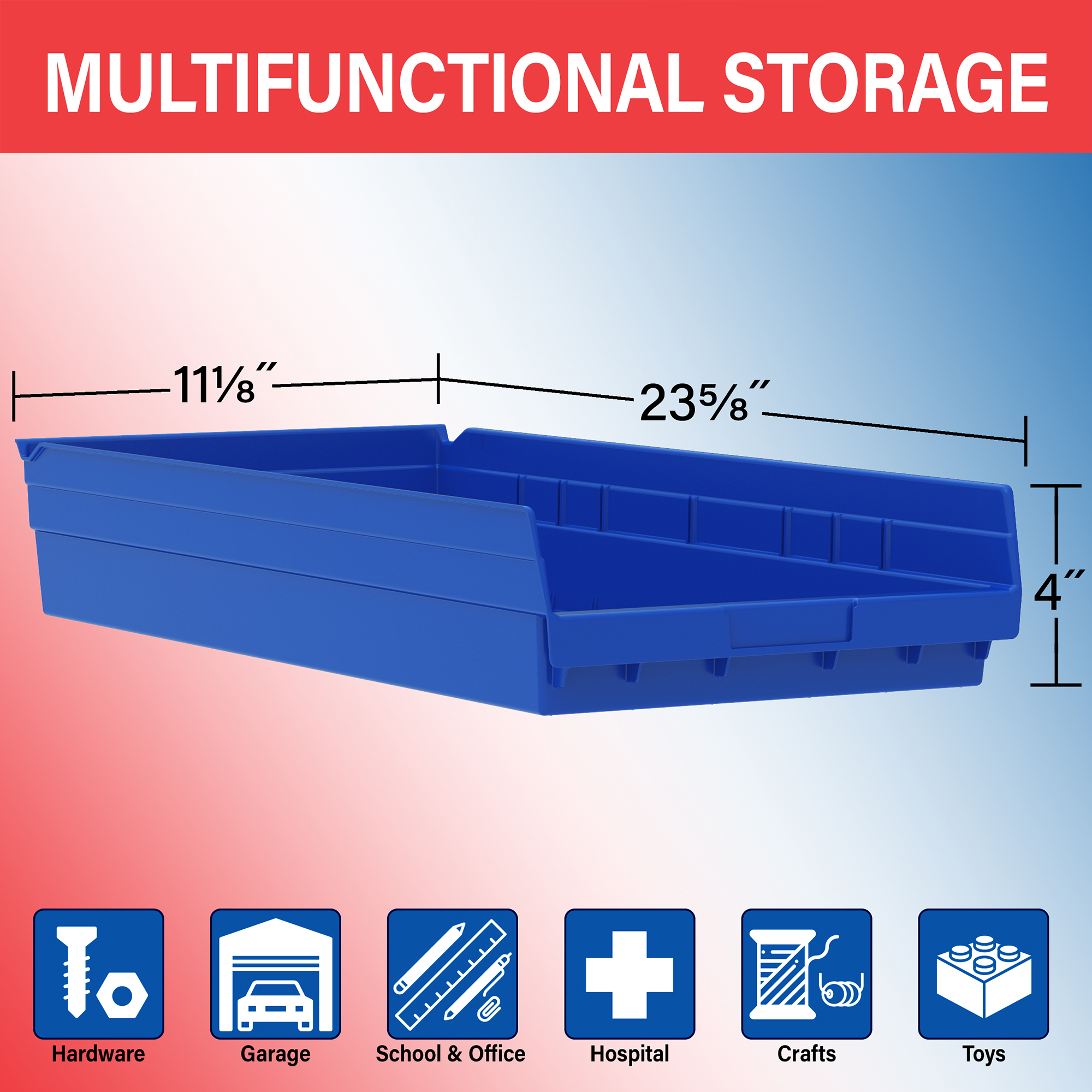 Measuring 23.63-inches long by 11.13-inches wide by 4-inches tall externally and 22.13-inches long by 10-inches wide by 4-inches tall internally, each bin offers generous capacity in a practical footprint. Proudly made in the USA, these easy-to-clean storage bins deliver durable, high-capacity organization you can count on.