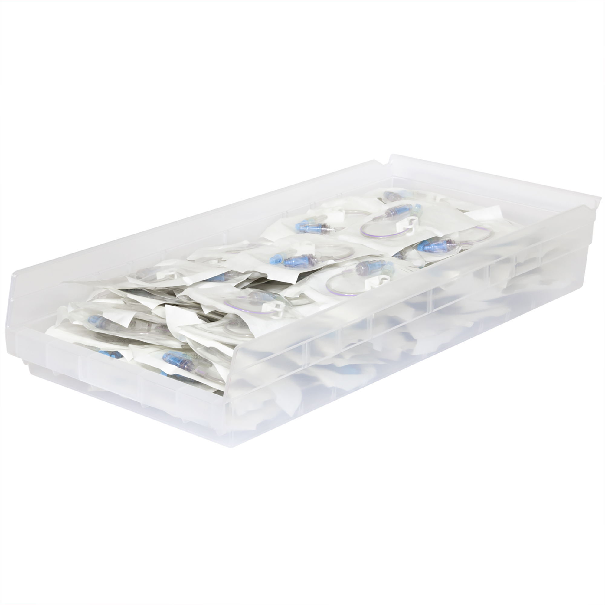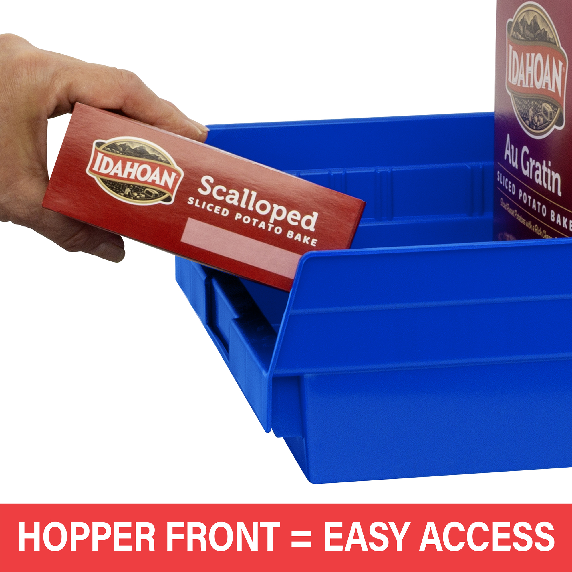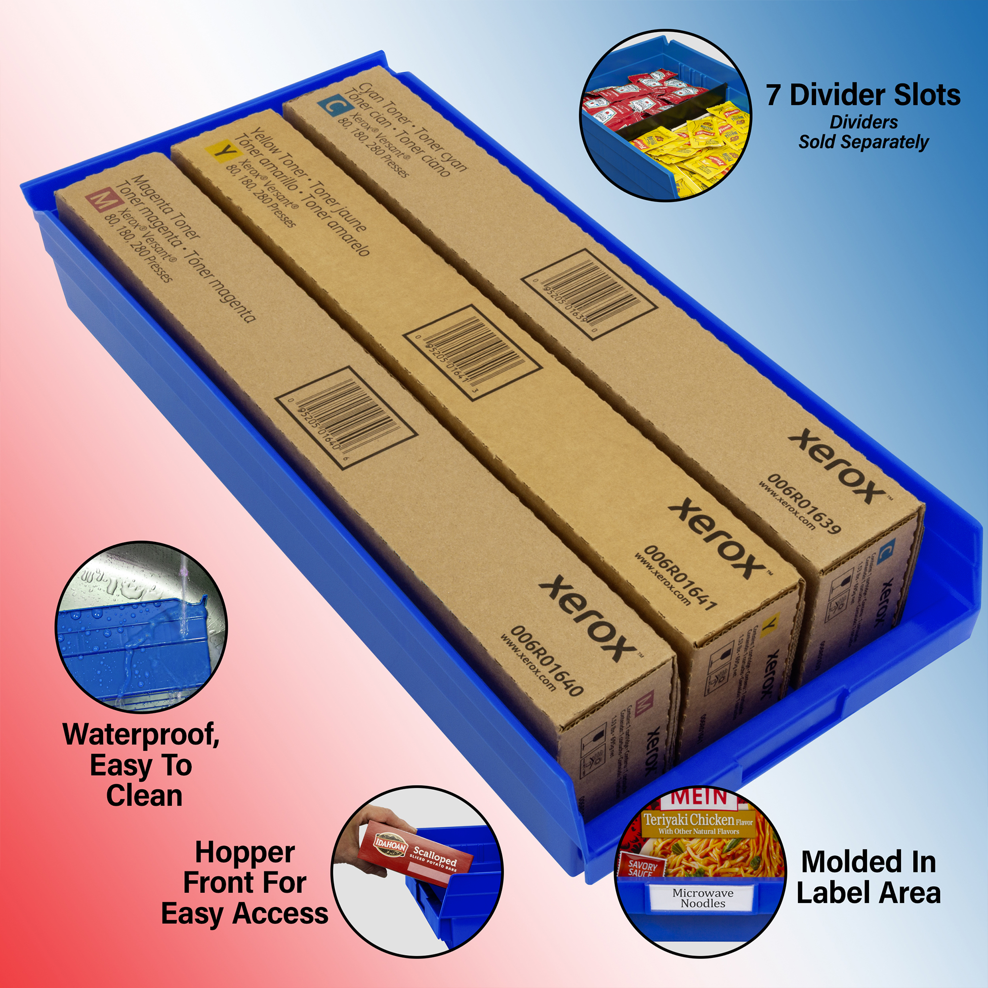 The smart, space-saving design allows the bins to stack securely, maximizing vertical storage while freeing up valuable floor space. An extra-wide stacking ledge enhances stability and helps prevent spills, while the built-in anti-slide stop keeps stacked bins from shifting forward. For customizable organization, optional dividers and label holders, sold separately, allow you to tailor each bin to your needs and create an efficient storage system. These bins can also be paired with compatible shelving or cabinets, sold separately, for an even more streamlined setup.