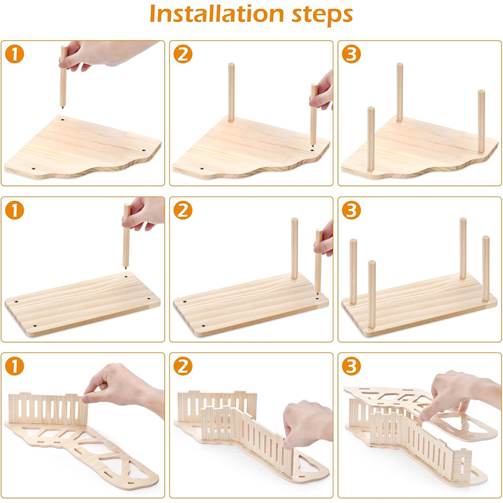 EASY TO INSTALL: Our wooden small animals stand platform is effortless to assemble, just tighten the wooden stick against the holes on the board, no other tools needed, suitable for all kinds of hamster cages. You can also place food trays, water bowls, running wheels and other decorations on it to create a comfortable and interesting environment for your hamster.