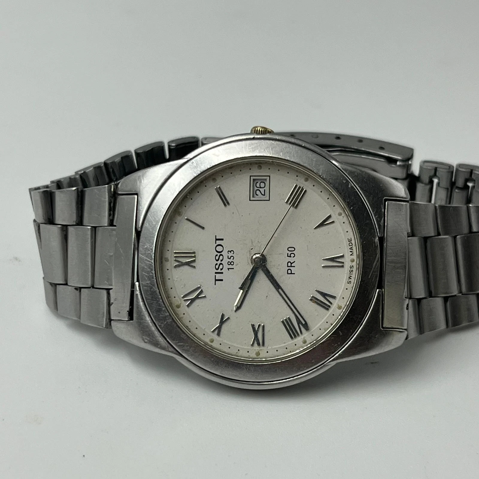 Tissot PR50 Chronograph Men’s Watch J378/478 Swiss Quartz Stainless Steel 40mmTissot PR50 Chronograph Men’s Watch J378/478 Swiss Quartz Stainless Steel 40mm Vintage Tissot PR 50 men’s wristwatch, Swiss made and well known for its reliability and classic design. This watch features a clean silver dial with elegant Roman numeral hour markers, giving it a timeless and sophisticated look suitable for both daily wear and formal occasions. Powered by a Swiss quartz movement, the watch offers excellent accuracy and low maintenance. It is fitted with a scratch-resistant sapphire crystal, a premium feature that adds durability and long-term clarity. The stainless steel case is solid and well proportioned, while the date window at the 3 o’clock position adds everyday practicality. The dial is clearly signed TISSOT 1853 and Swiss Made, confirming authenticity. ⚠️ Important Note: Condition: