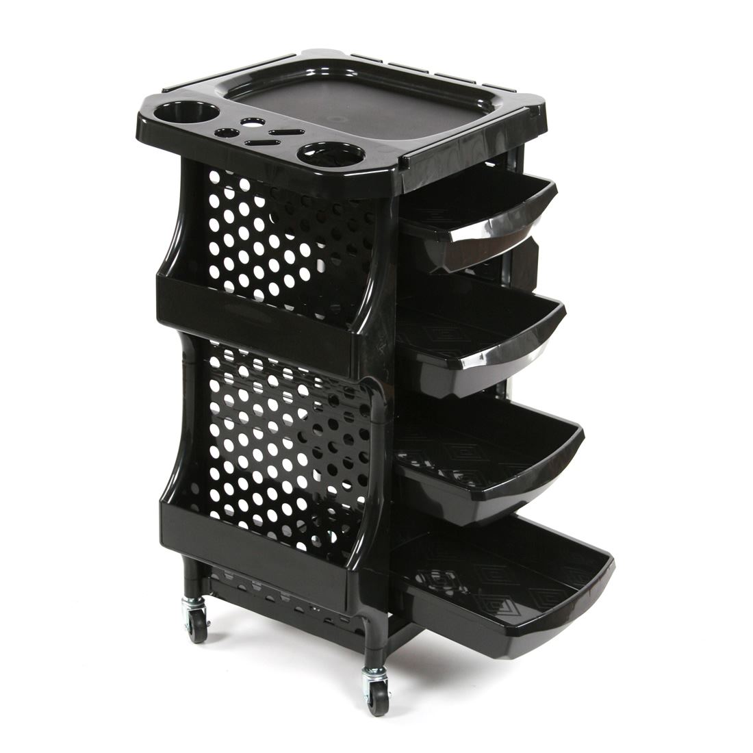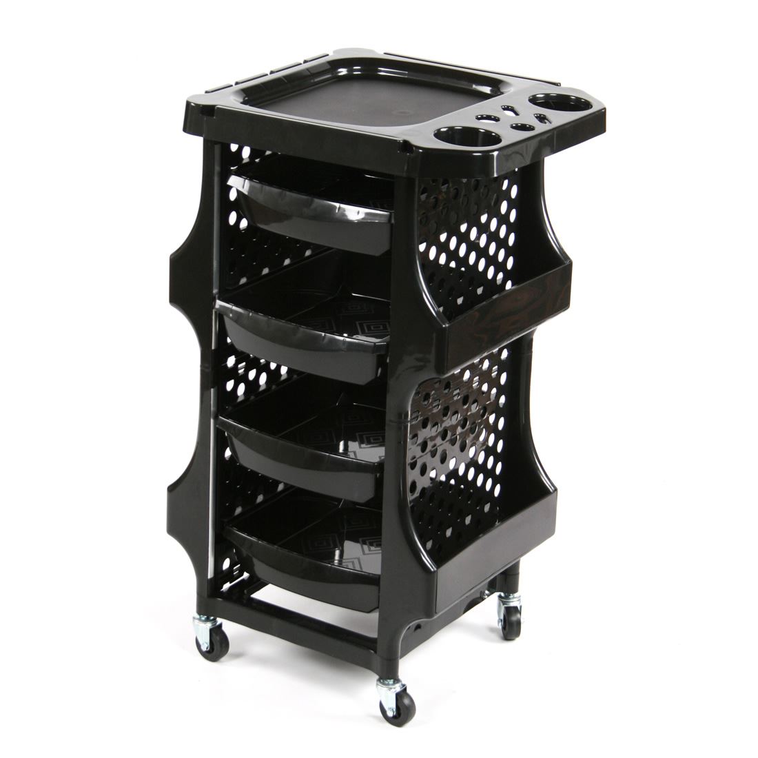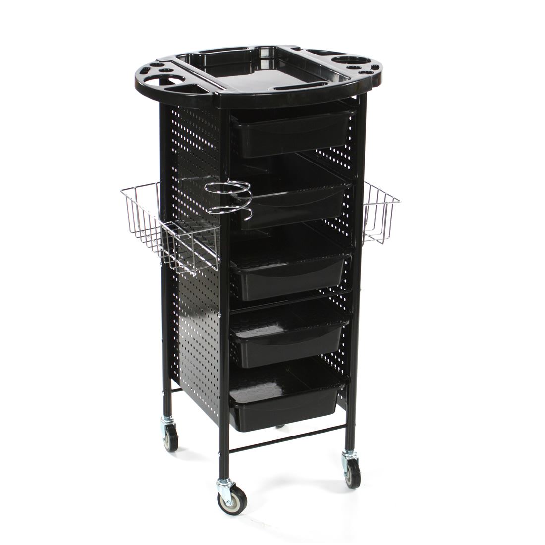 Studio Salon Trolley fornisce soluzioni di archiviazione intelligente mentre esegui i tuoi servizi di colore e styling. Viene fornito con quattro vassoi che facoltativamente si muovono e si bloccano in posizione per proteggere i tuoi strumenti e gli scaffali laterali perfetti per conservare oggetti più grandi come grafici a colori, sviluppatore di litri e bottiglie di shampoo. Viene anche fornito con una fondina per asciugacapelli in modo da poter eseguire pompini.