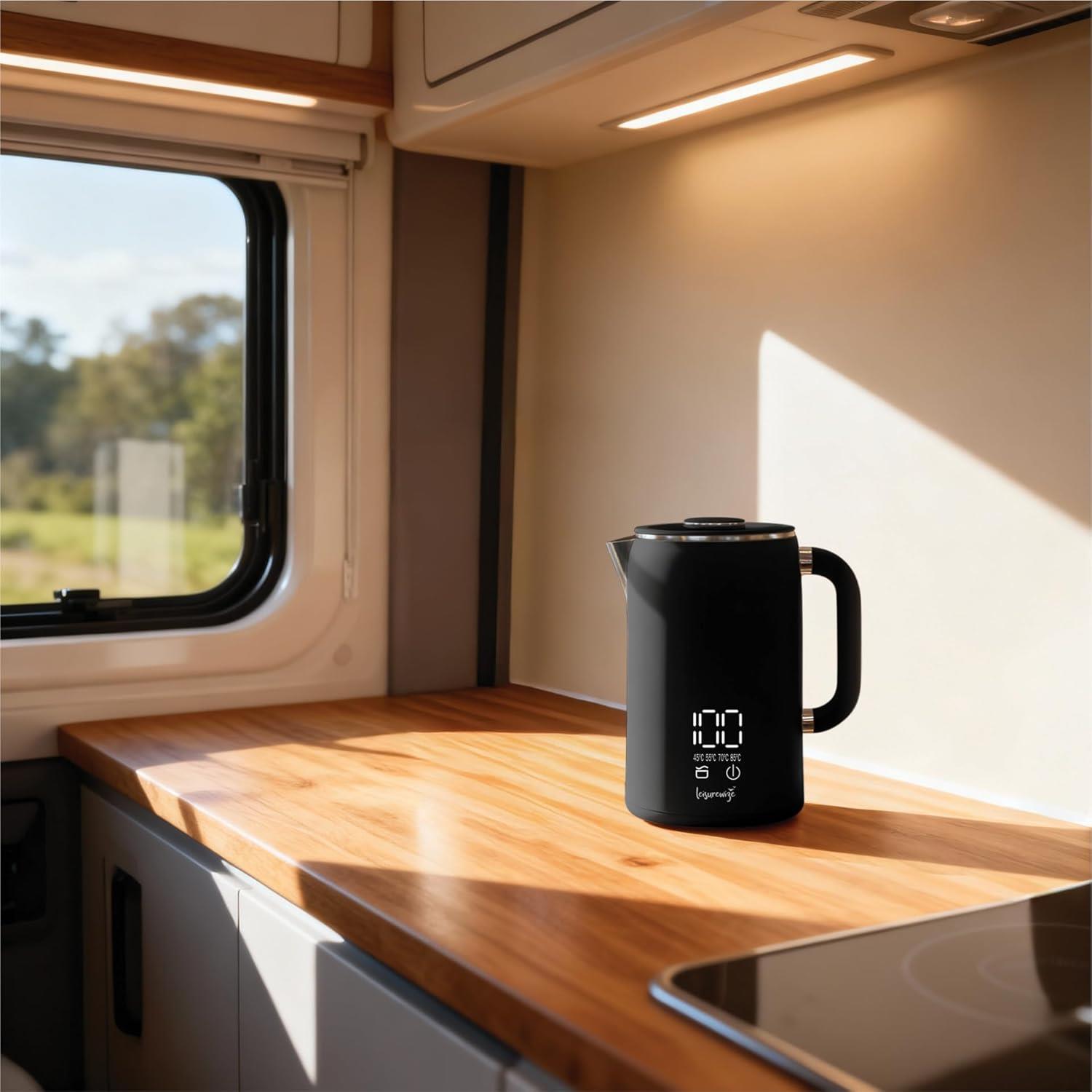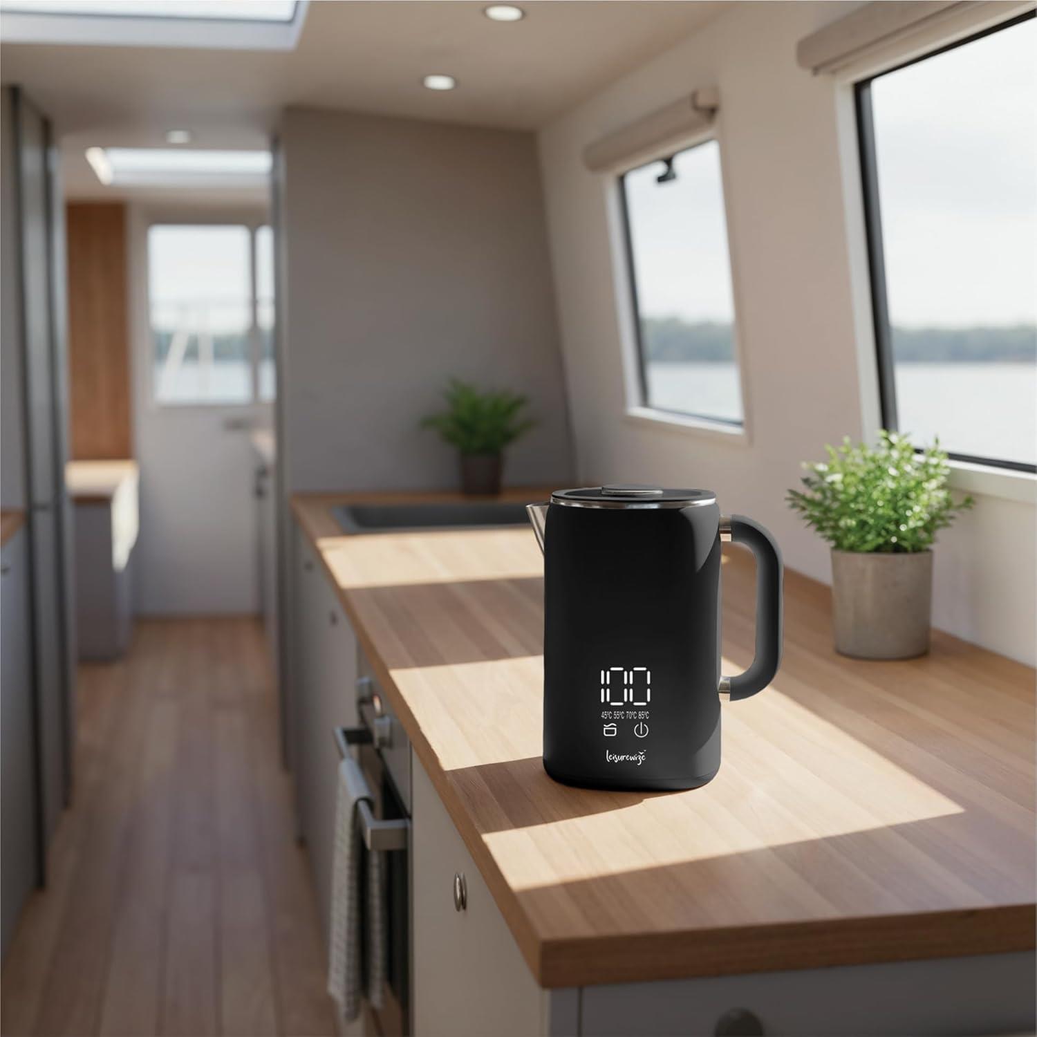 The LED display mains electric kettle with touch control allows precise water heating from 45–100°C. Makes perfect black, green or herbal tea, coffee, cocoa or other favourite drinks every time, by pre-setting the ideal temperature. Excellent for use in caravans, motorhomes and campervans. Boils up to 1.7L, powered by a 1000W element. Automatic shut-off prevents overheating for added safety. Manufactured from food safe 304 Stainless Steel material with a matte finish, combining longevity with modern design. Features