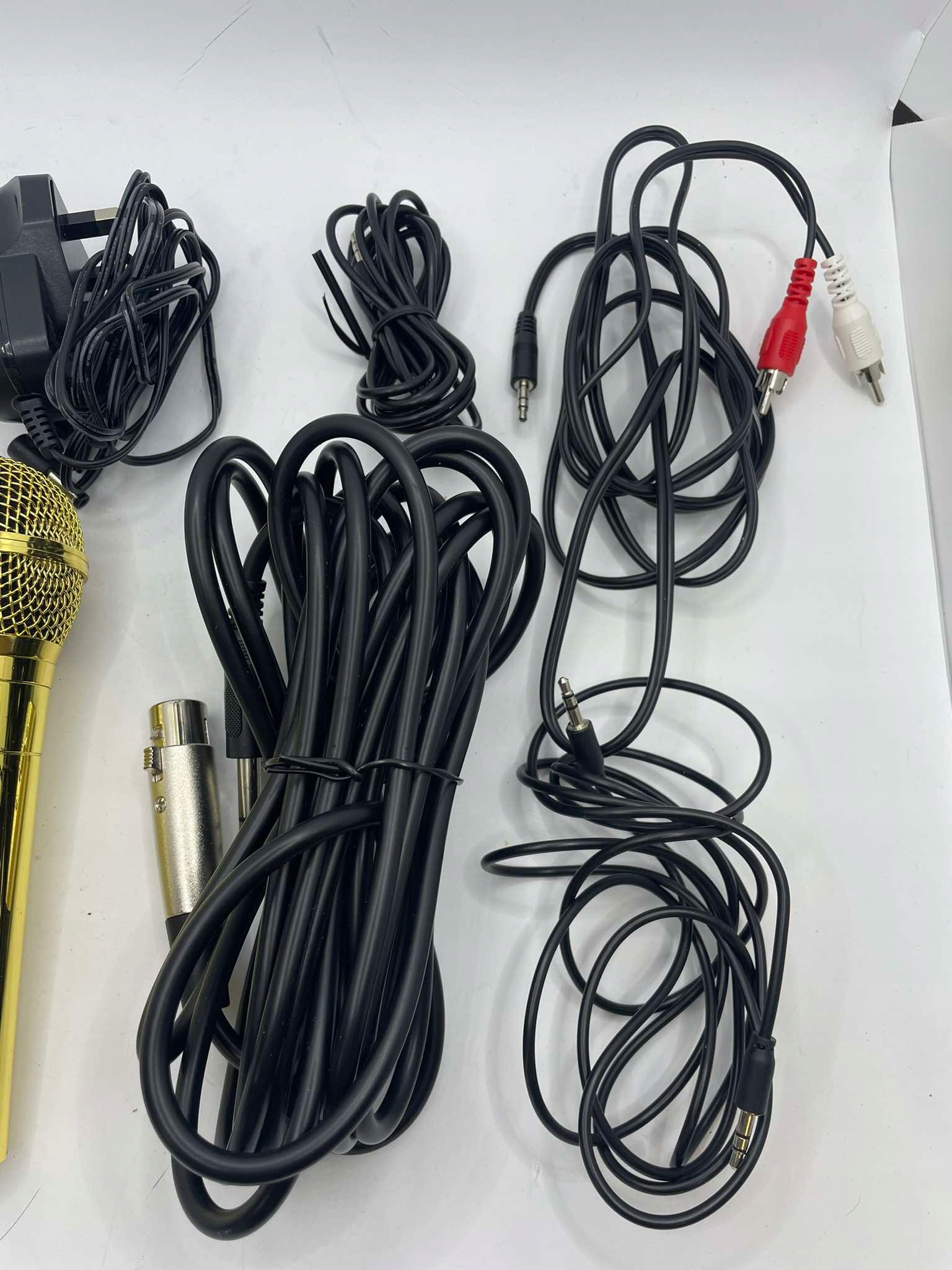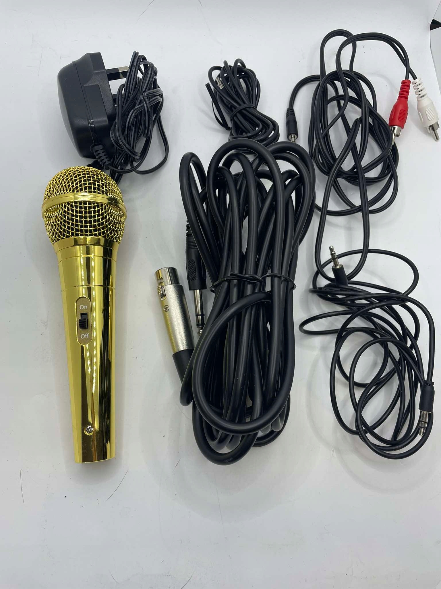 Enthält: 1 x goldenes Mikrofon, 1 x schwarzer kompakter Mikrofonmischer, 1 x 5 m langes Mikrofonkabel, Kabel zum Anschluss des Sets an einen Computer/iPad, AUX-In-Kabel zum Anschluss des Sets an einen Fernseher/eine Hi-Fi-Anlage