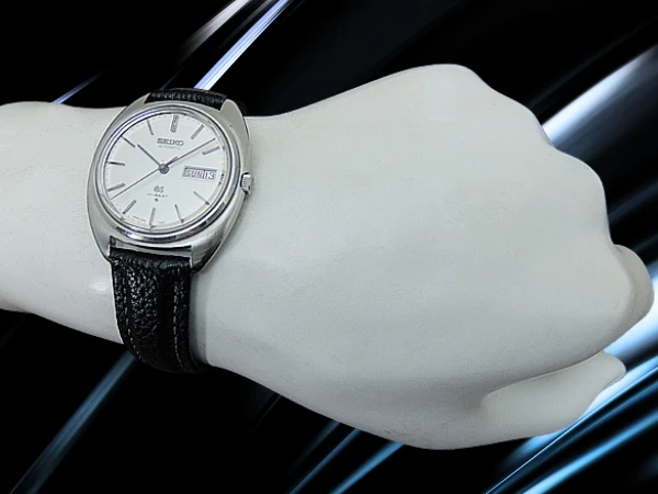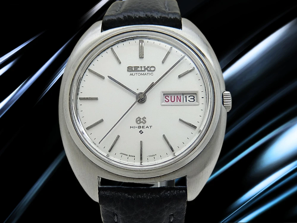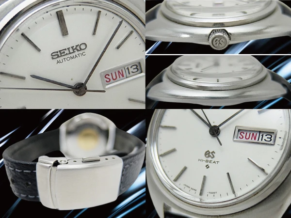 Grand Seiko 5646-7000 Hi-Beat 56GS Automatic 36mm Silver Dial This is the Grand Seiko 56GS Hi-Beat Ref. 5646-7000 manufactured in 1970. It features the distinctive “egg case” design with smooth flowing curves around the lugs. The silver dial is equipped with multi-faceted applied baton indexes and pencil hands. The day-date display at 3 o’clock supports Japanese and English switching. The caseback features the gold GS medallion, and the crown is signed. The movement is the 28,800 bph Cal.5646A automatic. Year: 1970 Movement: Automatic (Cal.5646A) Jewels: 25 Case Material: Stainless Steel Case Diameter: Approx. 36mm (excluding crown) Case Thickness: Approx. 10mm (including crystal) Lug Width: 18mm Dial Color: Silver Dial: Stains, dirt, and peeling around the outer edge are present due to aging. Hands and indexes show light deterioration. Case: Scratches, small scratches, and light dents are present. Caseback: Case opener marks are present. Engravings and GS medallion remain clear. Crystal: Scratches and small scratches are present. Strap: Aftermarket leather strap with signs of wear and deterioration. Buckle: Aftermarket deployant buckle (D buckle). Functions: Manual winding and automatic winding operate. Date changes at first crown position; time adjustment at second position. Hack function operates. Time deviation measured within 100 seconds per 24 hours; positional variance may occur. Watch head only. No box, no papers. Time deviation: ±30 seconds/day Diameter: Approx. 36mm Lug Width: 18mm Thickness: Approx. 10mm Lug-to-Lug: Approx. 41mm