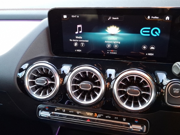 EQ navigation services - map (range display), display charging stations, programming of charging settings and pre entry climate control, MBUX multimedia system with 10"" Digital instrument cluster and 10"" media display with touchscreen, AMG Line bodystyling including AMG front apron with integrated air curtain and AMG rear apron with diffusor optics, LED High performance headlamps with adaptive highbeam assist, Privacy glass - heat insulating dark tinted glass, 3 spoke AMG multifunction sports flat bottom steering wheel in nappa leather with galvanised shift paddles, Ambient lighting with choice of 64 colour settings, 40:20:40 split folding rear seats, AMG sports seats, THERMOTRONIC automatic climate control