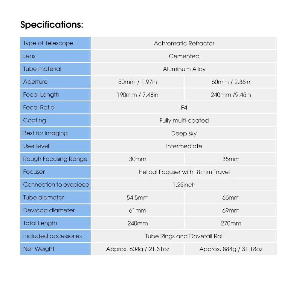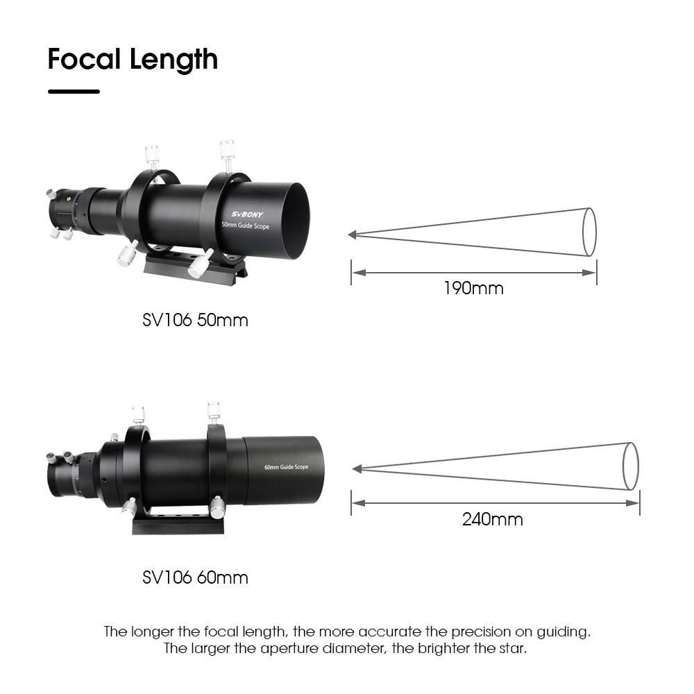 - This sturdy guidescope will help you shoot higher quality astronomical photos. With its 50mm/60mm lens and smooth spiral focusing lens, the multifunctional guidescope with spiral focusing lens is an ideal addition to all astronomical photographers' equipment. In addition, you can use this handheld telescope as a luxurious viewfinder by inserting the 1.25-inch eyepiece (not included). The practical benefit of doing this is that before guiding, you can insert the eyepiece into the guidescope and easily align it with the main imaging telescope, then remove the eyepiece and install the automatic guiding camera.