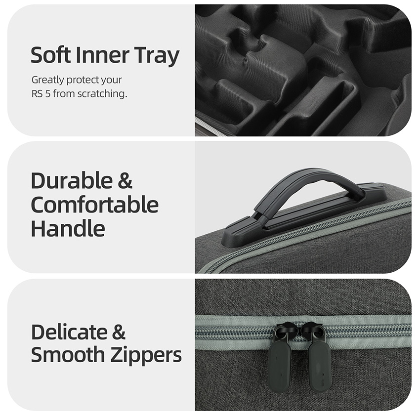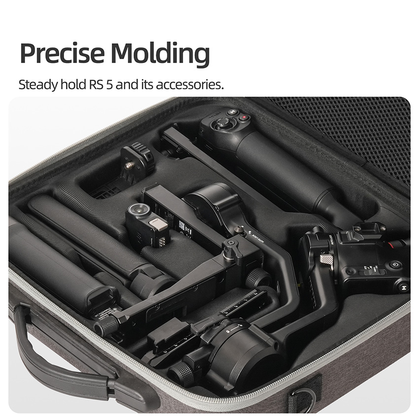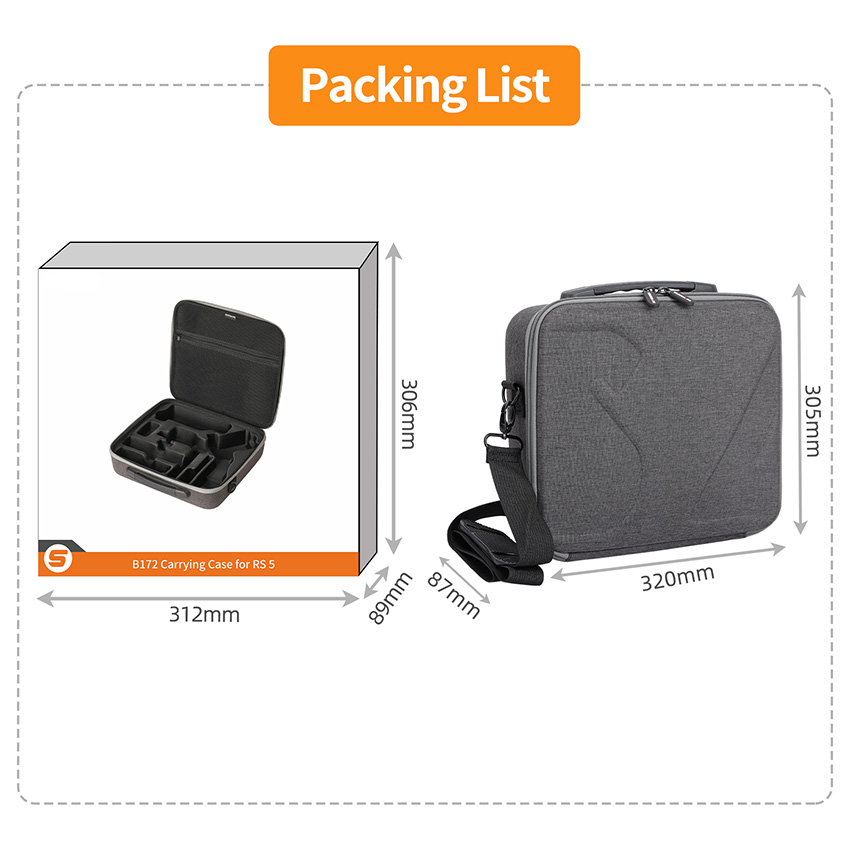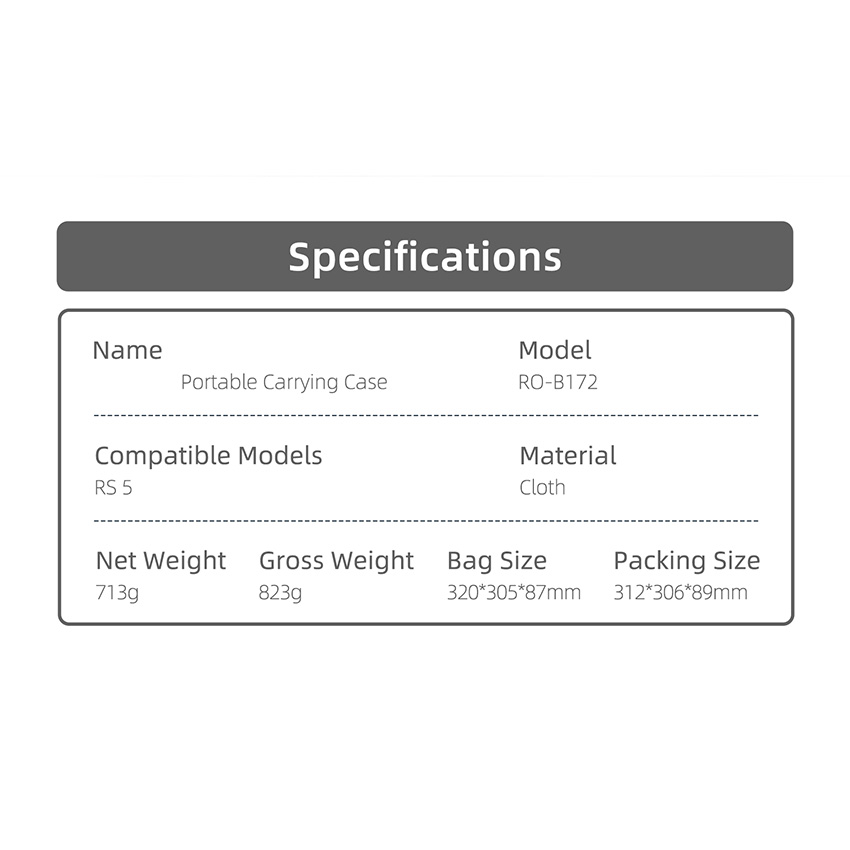 RO-B172 Portable Carrying Case for RS 5 Feature: l High quality for professional use l Large-Capacity Kit Bag accommodates gimbal, battery handle, dual-layer quick-release plate, quick-release tripod, Smart/Enhanced Smart Tracking Module, electronic handgrip adapter, gimbal mounting adapter plate, plus lens mount bracket, data cables, screw sets, and other small accessories l Precision-molded specifically for the RS 5 gimbal, it securely holds the body and accessories while providing shock absorption and drop protection for meticulous care l Includes an adjustable strap for cross-body, single-shoulder, or handheld carrying Specification: l Material: Cloth l Color: Black l Size: 30.5x 32x 8.7cm l Applicable Model: for RS 5 l Quantity: 1 PCS Package: l 1x Portable Carrying Case Note: l Only the above package content, other products are not included