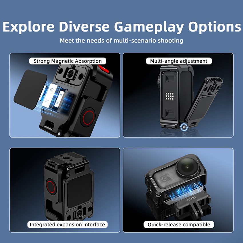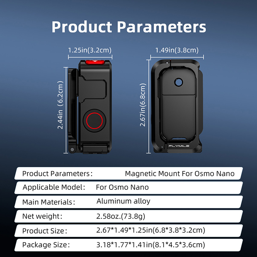Feature: l Strong Magnetic Back-plate: built-in magnets enable quick-release and secure attachment to devices l Multi-Port Expansion: features cold shoe and 1/4” screw threads for mics, lights, and more l Shooting Modes: switch freely between handheld, mounted, and extended shooting modes l Comprehensive Interface Design: multiple ports offer extensive compatibility with professional accessories l Durable Aluminum Body: CNC-machined structure offers reliable impact resistance l 180°Adjustable Back-plate: flexible magnetic plate allows for creative high and low-angle shots l Portrait/Landscape Ready: seamlessly switch between horizontal and vertical filming orientations l All-Scenario Ready: perfect for vlogging, live streams, sports, and various shooting needs l Lightweight Design: ergonomic and light structure reduces fatigue for extended filming l 1Free Lens Cover & Magnet Includes a silicone lens cap and metal plate for extra protection and compatibility Specification: l Material: Aluminum Alloy l Color: Black l Size: 2.67x 1.49x 1.25in(6.8x 3.8x 3.2cm) l Applicable Model: for DJI OSMO NANO Camera l Quantity: 1 Set Package: l 1x Magnetic Mount + 1x Magnetic Sheet Note: l Does not include the gimbal camera, backpack clips, bike mounts, extension poles, tripods, neck and chest straps and other accessories l Transition: 1cm=10mm=0.39inch l Since the size and weight are manually measured, due to different measurement methods, there may be a certain error between the weight and size of the product, but this error does not affect the normal use of the product, please confirm that you know and accept the error before purchasing l Due to the difference between different monitors, the picture may not reflect the actual color of the item,please make sure you do not mind before ordering, Thank you!