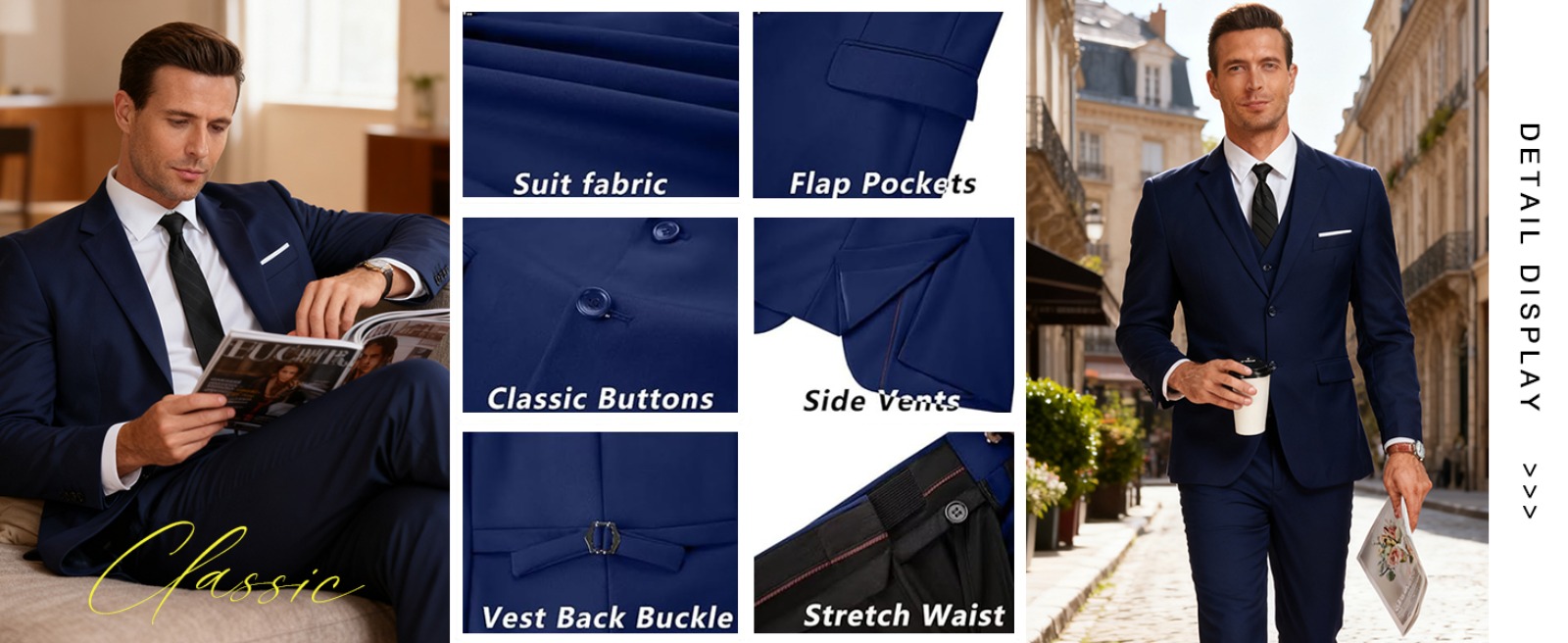 - High-Quality Material-2 Pieces : Jacket: Single breasted/ Two buttons/ Notch lapel; Pants: Flat front/ Expandable waist; Vest: buttons/ V-neck vest. Soft and comfortable, absorbent,good air permeability, can reduce skin irritation.