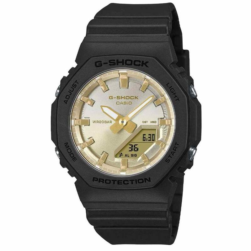 Experience the radiance of a wristwatch influenced by stunning summer sunsets, from the latest GMA-P2100SG series- our smallest design to date. The dial showcases a gradient of gold inspired by the sunset, a black band made of bio-based resin, a powerful super illuminator (with high-brightness double LED light), and all the beloved features of a G-SHOCK. This new color scheme adds a touch of luxury resort elegance to your timepiece.