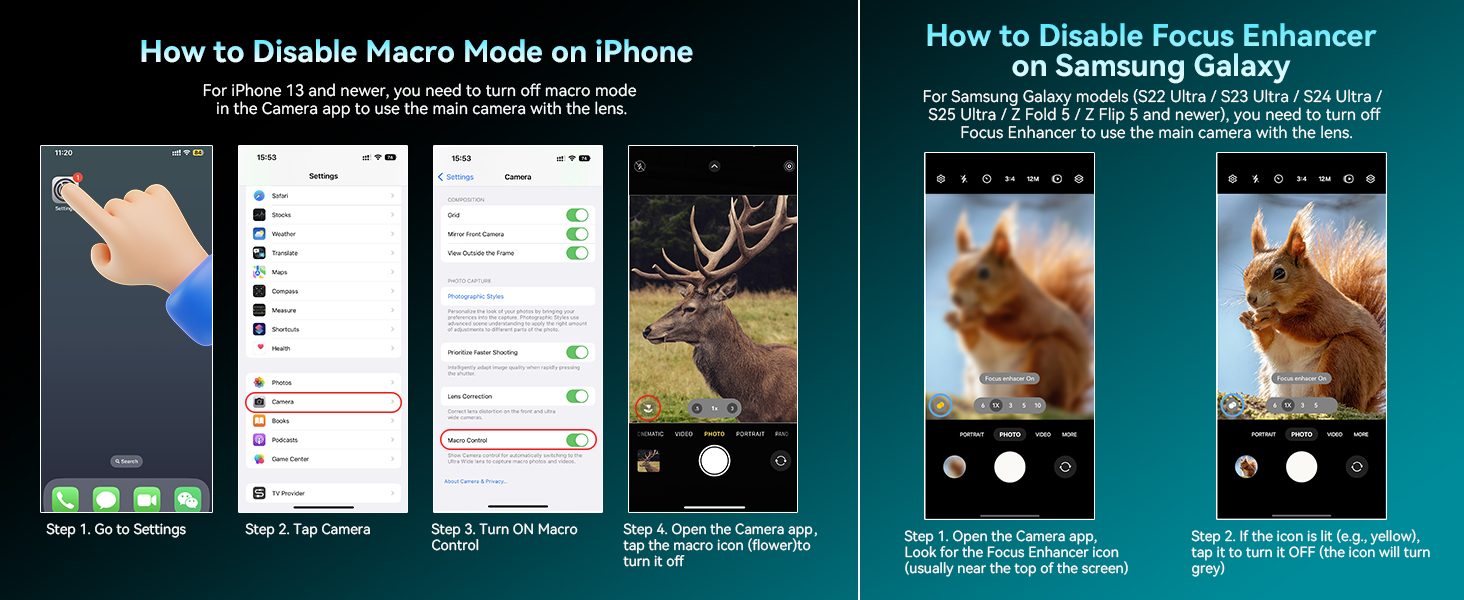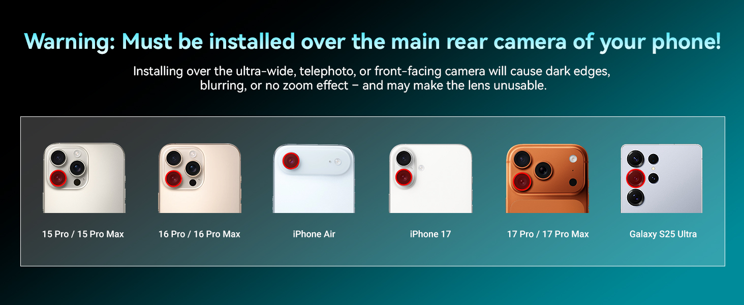 【Exclusive Compatibility】Designed as a universal phone camera lens, it is compatible with iPhone 15/16/17 Samsung series. It can be installed on your phone's camera in just a few seconds—no tools or complicated setup required—to instantly upgrade your mobile photography