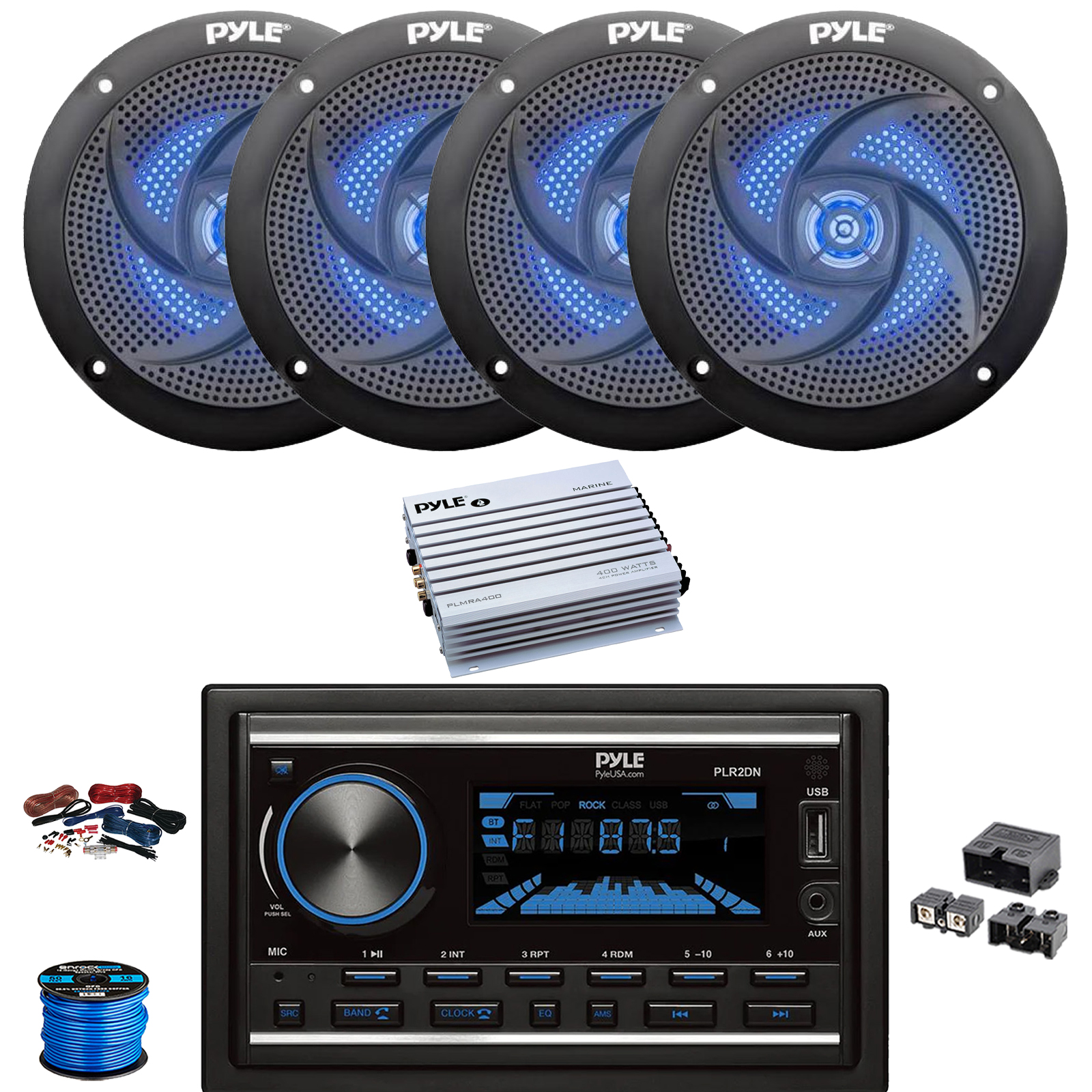 • PACKAGE BUNDLE INCLUDES: Pyle PLR2DN Double DIN Marine Bluetooth 300 Watt USB/AUX MP3 Player AM/FM Radio Stereo Receiver, 4x Pyle PLMRS63BL 6'' 240 Watt Max Power 2-Way Low Profile Blue Flashing LED Black Boat Speakers, Pyle PLMRA400 4 Channel 400 Watt Amplifier, 8-Gauge Amplifier Wiring Installation Kit, High Current Quick Disconnect Power Block, 50 Feet 16 Gauge Speaker Wire