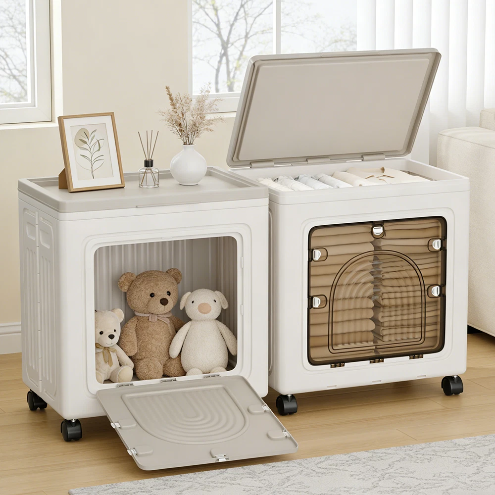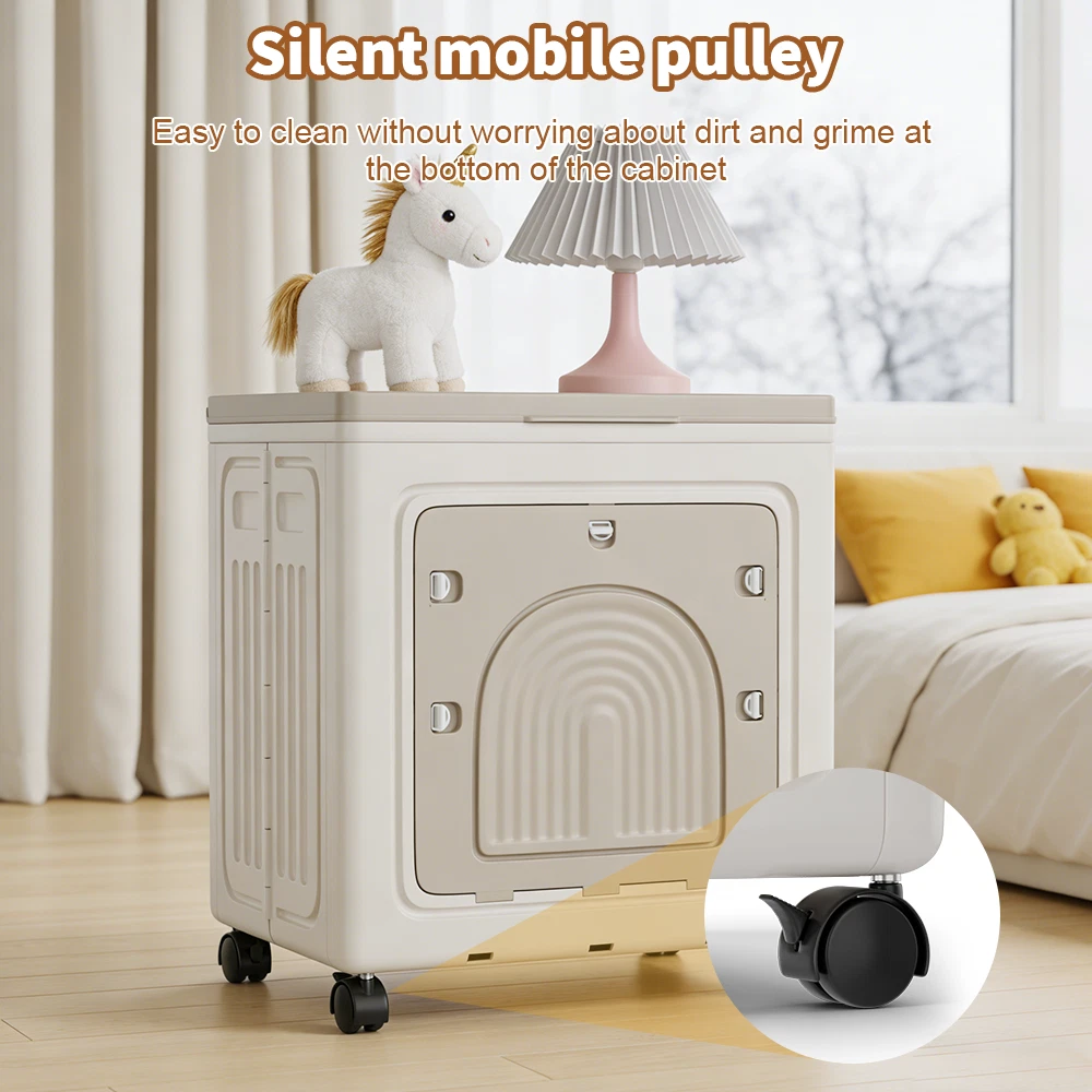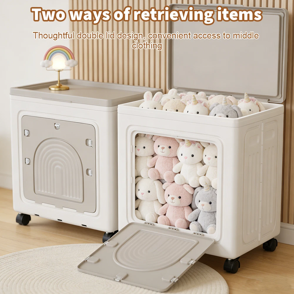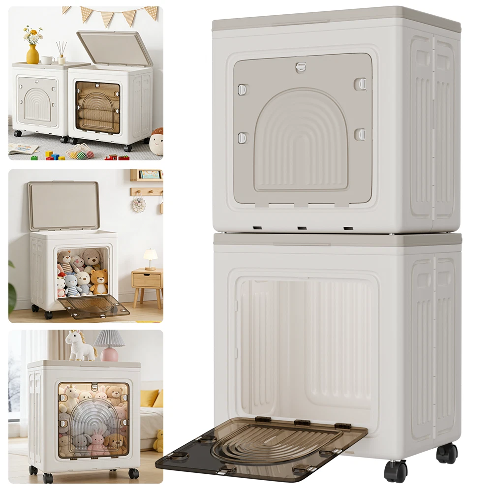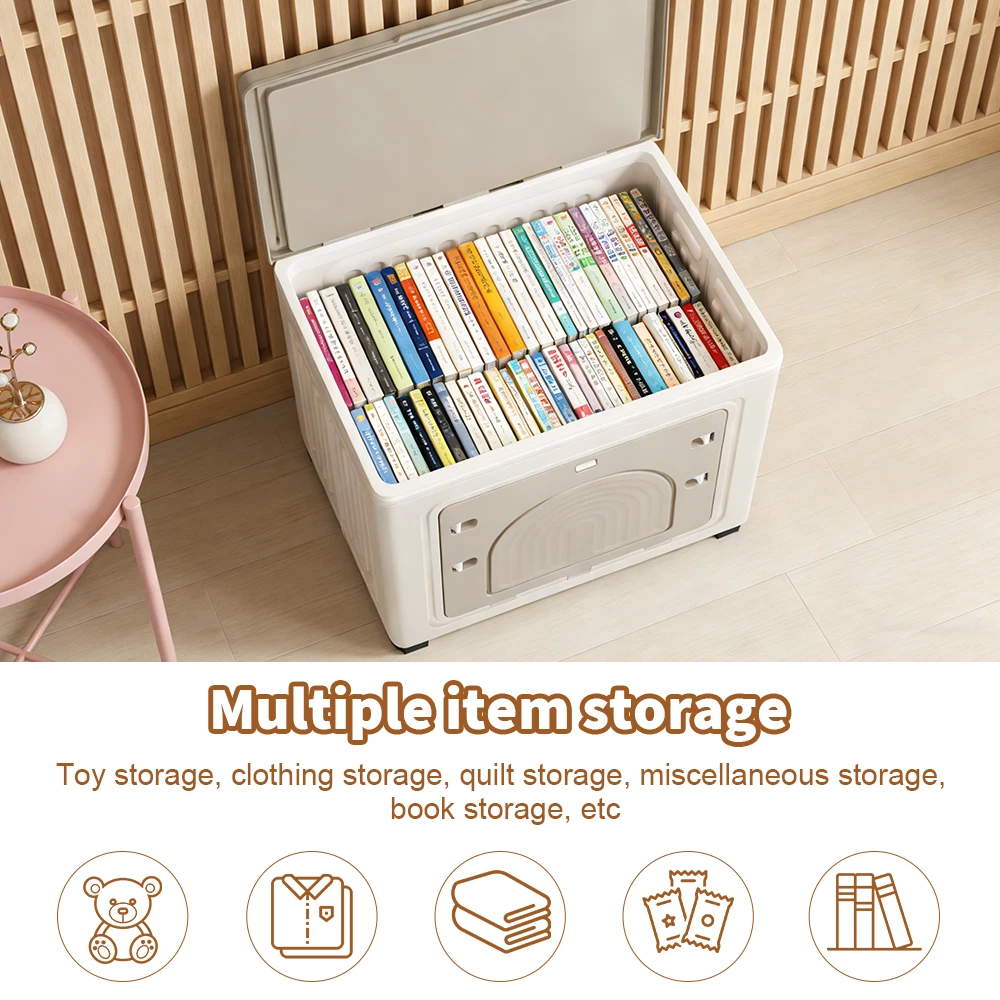 Description: Expanded size:59*35*59cm Folding size: 59*7*59cm; Wheel diameter: 3.5cm (2* wheels with brakes, 2* universal wheels); Two ways to retrieve items: front flip/top flip; Capacity: 100L; Easy to disassemble and assembleBuilt-in handle, easy to push and pull; Product use: storage of clothing, toys, cosmetics, office supplies, etc.