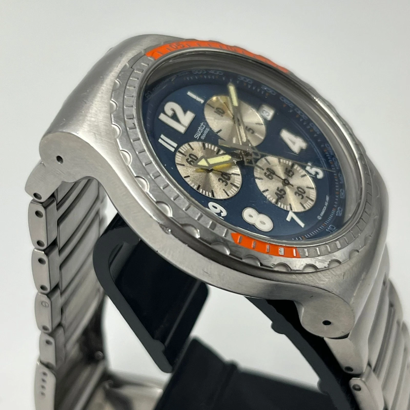 Swatch Irony Jumbo V8 Chronograph Men's Watch Swiss Made Blue Dial 47mmSwatch Irony Jumbo V8 Chronograph Men's Watch Swiss Made Blue Dial 47mm Description: Vintage Swatch Irony Jumbo V8 Chronograph Men's Watch Swiss Made with a beautiful blue dial and stainless steel case and bracelet. This model features the large Jumbo size case (approximately 47mm), chronograph function with three sub-dials, tachymeter scale, and a date window. It has a sporty and iconic Swatch design and is made in Switzerland. The watch is in good pre-owned condition and is currently running. There are normal signs of wear consistent with age and use. Please note: there is a very small scratch on the crystal near the upper left area. It is minor, barely noticeable, and difficult to see unless closely inspected. Key Features: Overall, this is a stylish and collectible Swatch Irony chronograph with a bold sporty design and large wrist presence. (all made with daylight, to show the color as authentic as possible). SHIPPINGI do ship worldwide by Registered mail With tracking number! Shipping time takes up to 21 business days. All additional payments such as tax, are the buyers responsibility. I ship only to the approved address that Registered in PayPal. PAYMENTWe accept major credit cards, PayPal, and eBay gift cards. Payment is due at the time of purchase. Orders will not be processed until payment is received. If there are any issues with your payment, please contact us immediately. Sales tax will be applied to orders shipped within applicable states. For any questions regarding payment, feel free to reach out via eBay messaging. Thank you for your purchase! ABOUT USSarhan Collectibles offers premium products from exquisite fine jewelry pieces to uniquely crafted items for your home. Each item is hand-selected, thoroughly examined, and tested to ensure that you receive your order in the same quality as described. Browse our selection of unique jewels and home decor. |