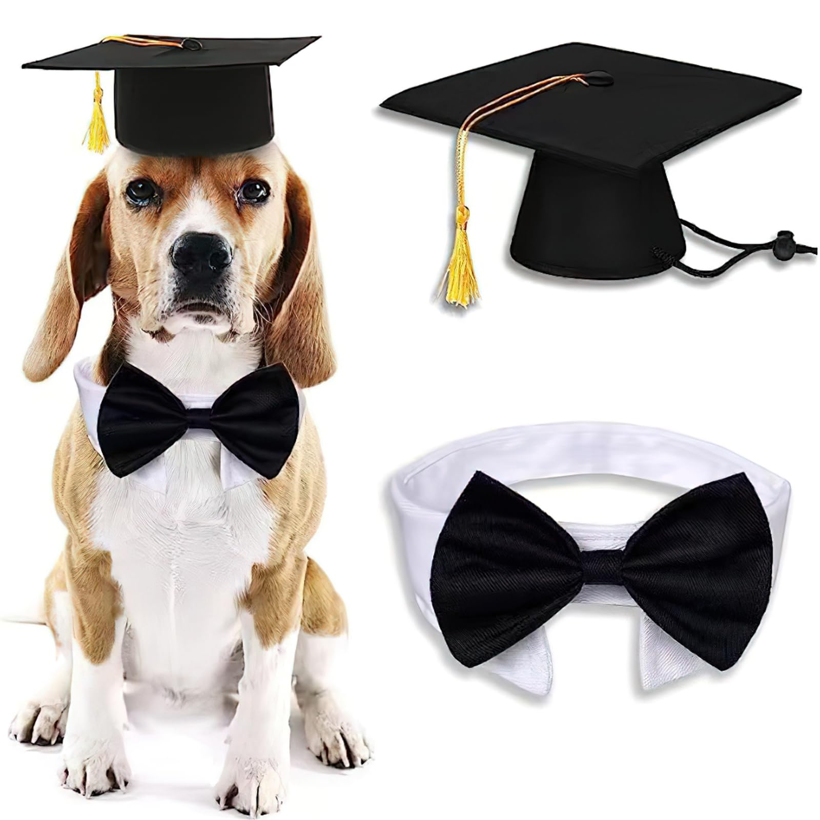 - Package includes: 1 pc pet graduation hat and a 1 pc pet tuxedo necktie. This set of dog graduation costume will make your dog look adorable and funny.Please measure the neck girth of your pet and refer to our size chart before choosing a size