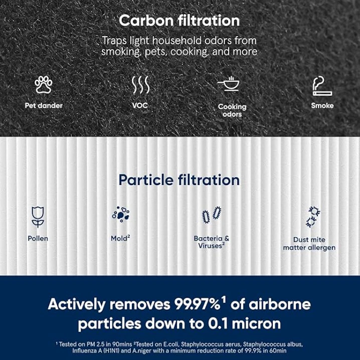 This filter combines advanced particle filtration with an activated carbon mesh layer for superior air purification.