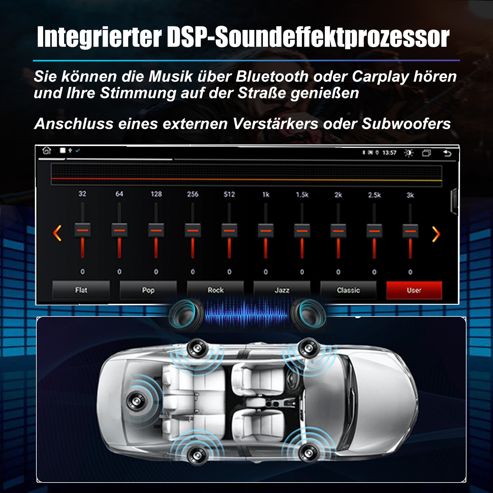 Bluetooth und DSP-Sound: Unterstützt Bluetooth 5,0, mit integriertem Mikrofon, damit Sie während der Fahrt freihändig telefonieren können. Unterstützt den Zugriff auf das Telefonbuch, die Musikwiedergabeschnittstelle usw. Eingebauter DSP-Chip. Unterstützt 36-Band-EQ-Einstellung, Mit der DSP-Funktion können Sie den Klang jedes Lautsprechers mithilfe verschiedener Entzerrungsmethoden individuell anpassen: Jazz, Rock, Pop, Klassik usw., um einen außergewöhnlichen Höreffekt für Sie zu erzielen!, die nach Ihren persönlichen Vorlieben eingestellt werden kann.